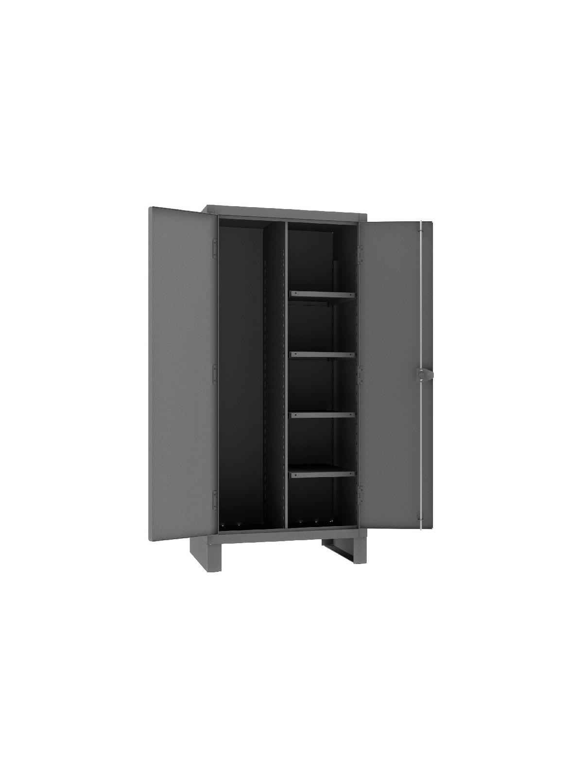Feature rugged, all-welded 12 ga. steel construction and handsome flush door design. 4 reinforced steel shelves are adjustable on 2-1/2” centers. Includes extra heavy-duty hinge pins that secure doors to avoid sagging. Sturdy 3-point, cast steel locking handles have 3/8” dia. rods and provision for padlock (padlock not furnished). 6" high box style legs offer space for lift truck forks and can be lagged to the floor, constructed of 3/16" steel. Durable Gray powder coat finish. FOB Shipping Point.