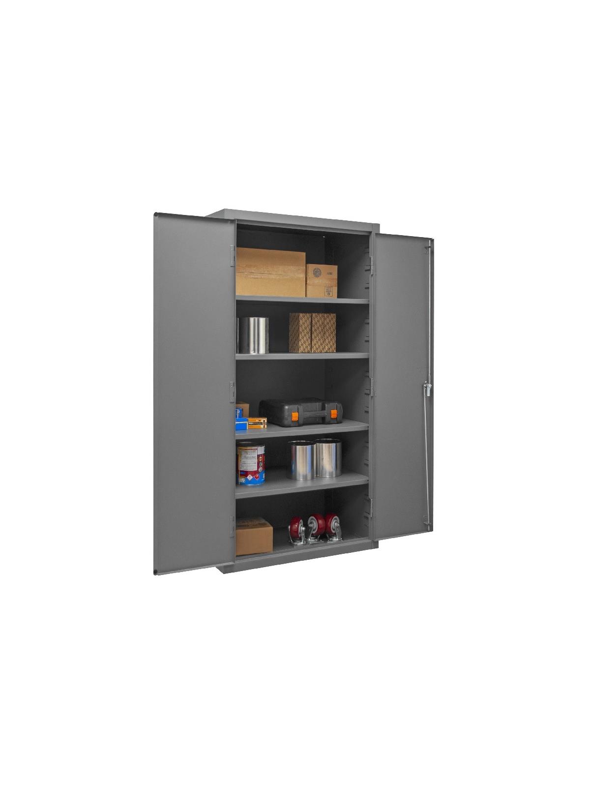 Industrial duty, all welded 16-gauge steel with 3-point locking system with keyed handle and lock rods, 4 keys included. Adjustable shelves rest on louvered panels and adjust on 4" centers. No tools required for installation. H2505 & H2506 models have 6"H base/legs which provide access for forklifts, pre-punched holes allow for lagging to the floor. (Constructed of 3/16" steel) Gray, textured powder coat finish. FOB Shipping Point.