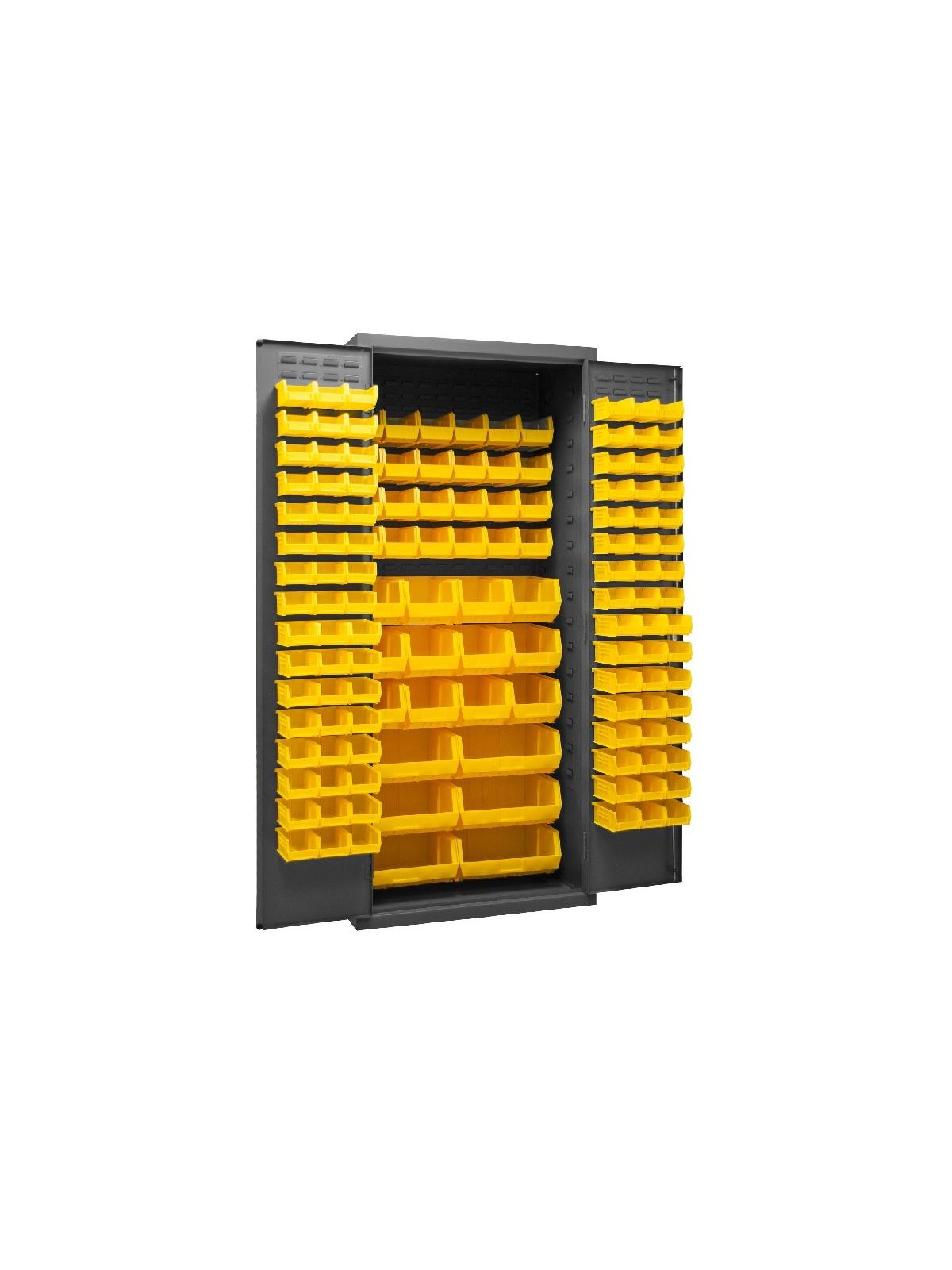 3-point locking system with keyed handle and lock rods, 4 keys included. Full height, formed and recessed doors with heavy duty, leaf hinges to prevent sagging and warping. Fully welded louvered panels reinforce door and accommodates Hook-On-Bins®. Hook-On-Bins® installed easily with no tools required. Hook-On-Bins® are included. Durable, gray textured powder coat finish. Available in three bin colors, Red (-1795), Blue (-5295), or Yellow (-95). FOB Shipping Point.
