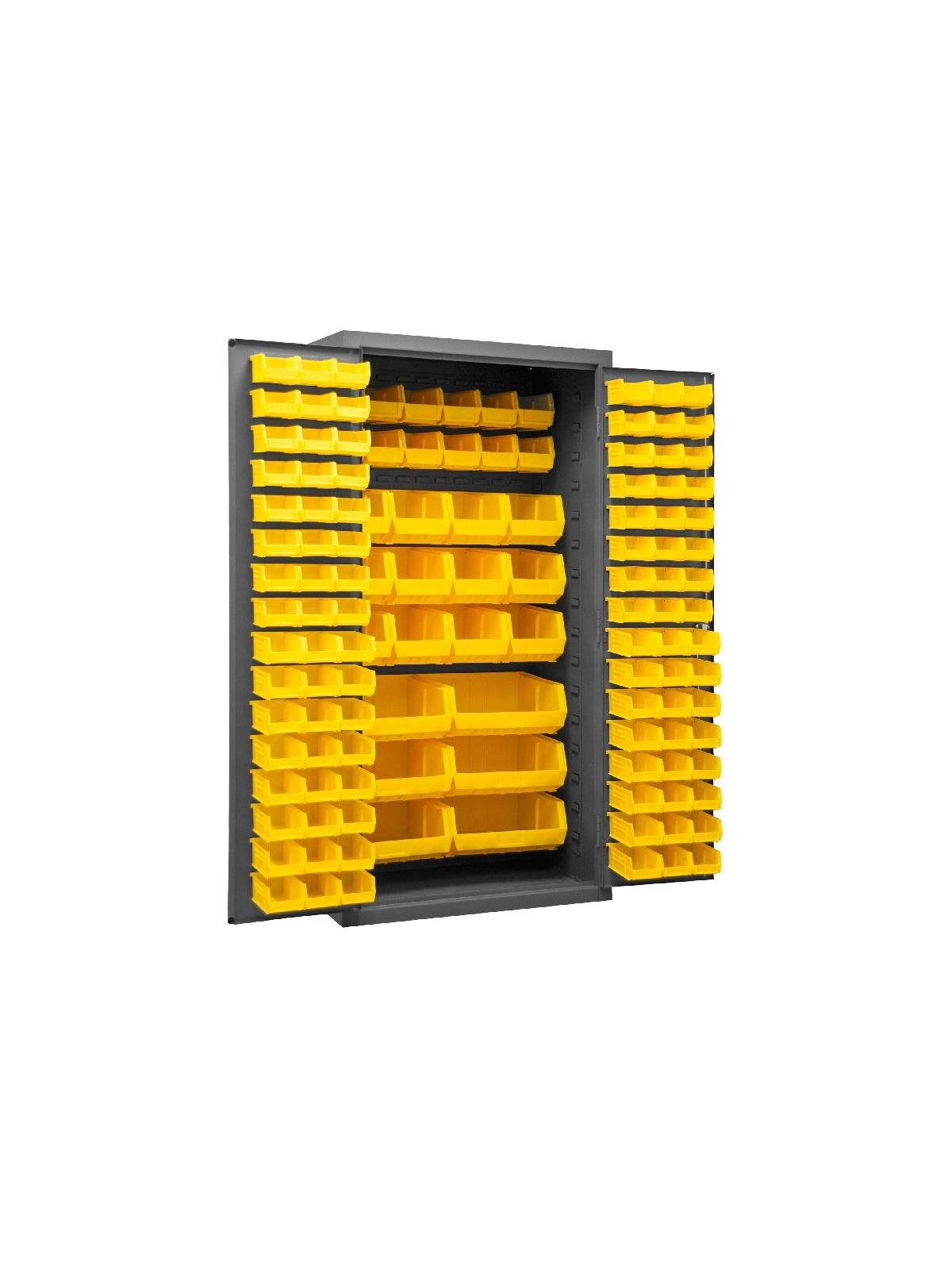 3-point locking system with keyed handle and lock rods, 4 keys included. Full height, formed and recessed doors with heavy duty, leaf hinges to prevent sagging and warping. Fully welded louvered panels reinforce door and accommodates Hook-On-Bins®. Hook-On-Bins® installed easily with no tools required. Hook-On-Bins® are included. Durable, gray textured powder coat finish. Available in three bin colors, Red (-1795), Blue (-5295), or Yellow (-95). FOB Shipping Point.