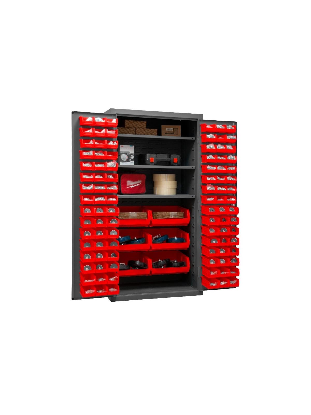 3-point locking system with keyed handle and lock rods, 4 keys included. Full height, formed and recessed doors with heavy duty, leaf hinges to prevent sagging and warping. Adjustable shelves rest on louvered panels and adjust on 4" centers. No tools required for installation. Fully welded louvered panels reinforce door and accommodate Hook-On Bins®. Hook-On Bins® installed easily with no tools required. Hook-On Bins® are included. Durable, gray, textured powder coat finish. Available in three bin colors, Red (-1795), Blue (-5295), or Yellow (-95). FOB Shipping Point.
