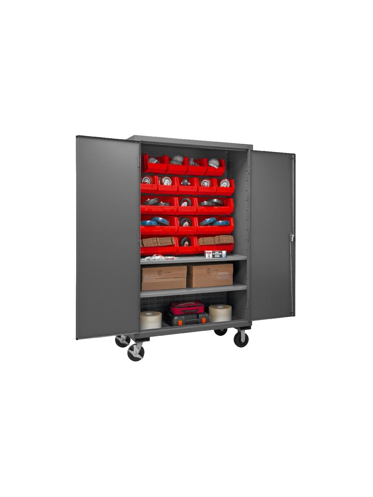 Industrial duty, all welded 16-gauge steel with 6" x 2" phenolic casters (2 rigid, 2 locking swivel). 3-point locking system with keyed handle and lock rods, 4 keys included. Side handle for easy maneuvering. Fully welded louvered panels reinforce back and hold Hook-On-Bins® and adjustable shelves rest on louvered panels and adjust on 4" centers. No tools required for installation. Hook-On-Bins® by Durham are included and install with no tools required. Gray textured powder coat finish. Available in three bin colors, Red (-1795), Blue (-5295), or Yellow (-95). FOB Shipping Point.