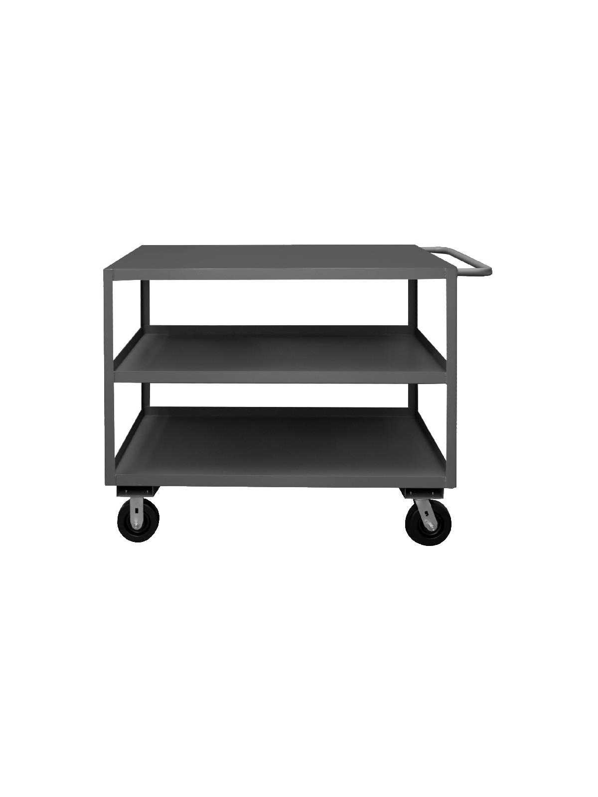 Shelf carts are constructed with 1-1/2" x 1/8" angle iron uprights for added strength. Heavy duty 14 gauge steel shelves. Sturdy tubular push handle. Perfect for transporting heavier parts or stock items. Shelf Stock Carts are available in 1,200 lbs. or 3,000 lbs. capacities. FOB Shipping Point.