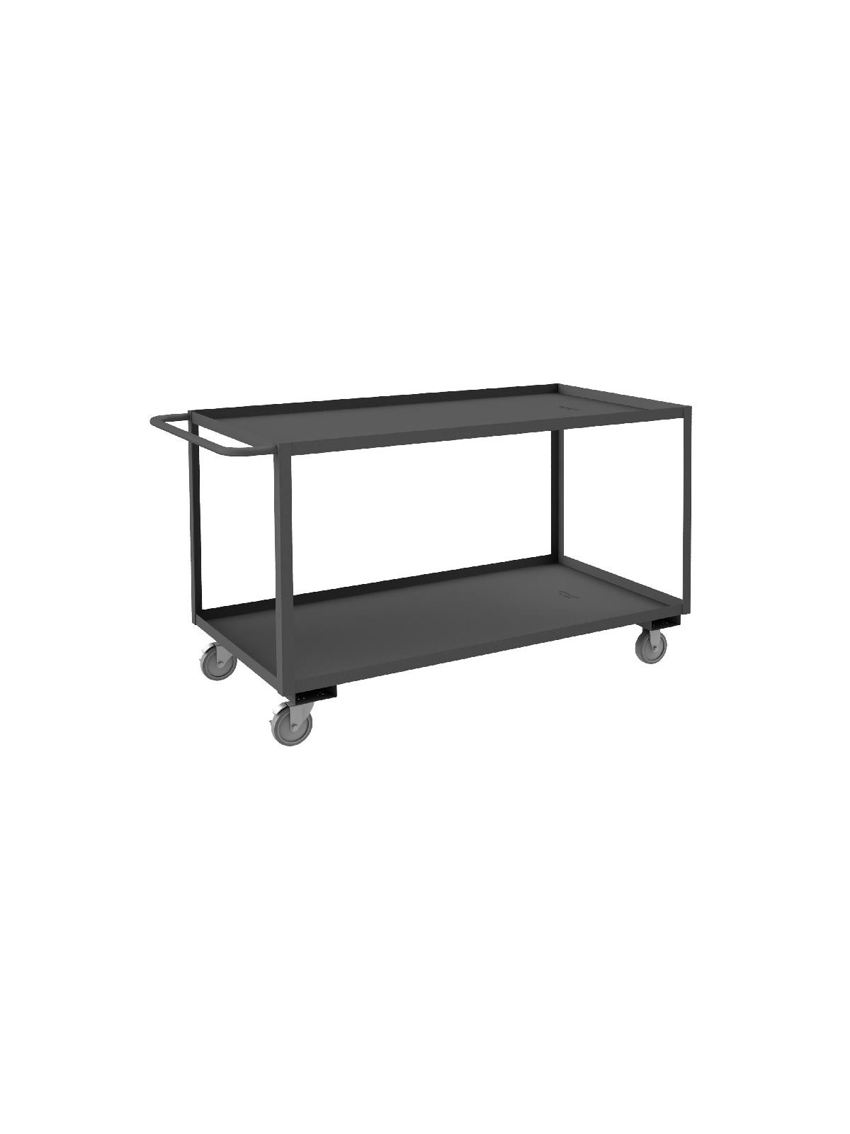 Shelf carts are constructed with 1-1/2" x 1/8" angle iron uprights for added strength. Heavy duty 14 gauge steel shelves. Sturdy tubular push handle. Perfect for transporting heavier parts or stock items. Shelf Stock Carts are available in 1,200 lbs. or 3,000 lbs. capacities. FOB Shipping Point.