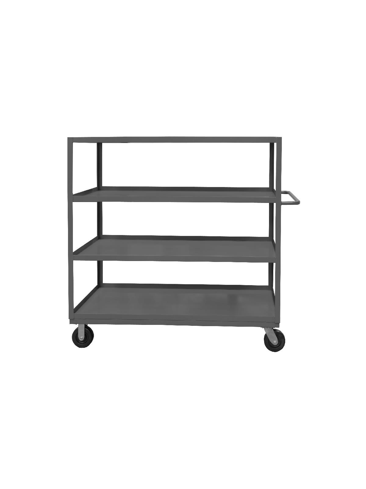 Shelf carts are constructed with 1-1/2" x 1/8" angle iron uprights for added strength. Heavy duty 14 gauge steel shelves. Sturdy tubular push handle. Perfect for transporting heavier parts or stock items. Shelf Stock Carts are available in 1,200 lbs. or 3,000 lbs. capacities. FOB Shipping Point.