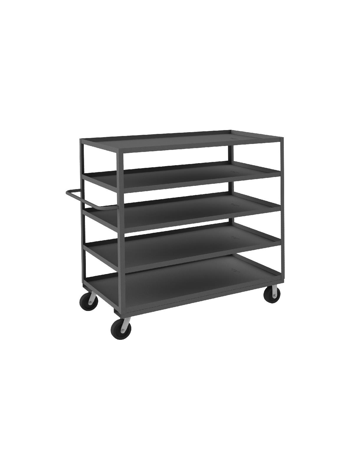 Shelf carts are constructed with 1-1/2" x 1/8" angle iron uprights for added strength. Heavy duty 14 gauge steel shelves. Sturdy tubular push handle. Perfect for transporting heavier parts or stock items. Shelf Stock Carts are available in 1,200 lbs. or 3,000 lbs. capacities. FOB Shipping Point.