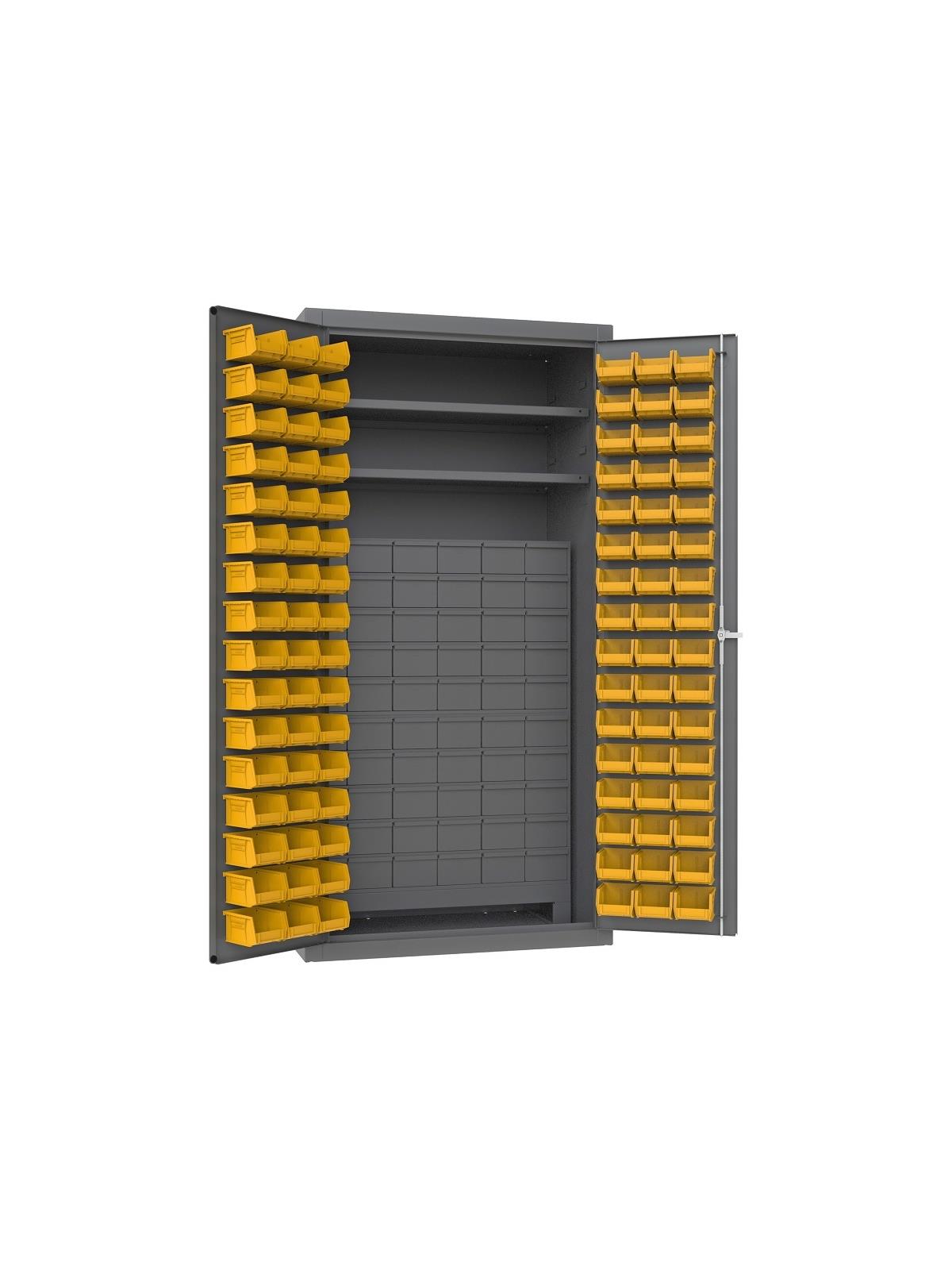 Cabinets are heavy duty 14 gauge construction and feature 2 adjustable shelves and louvered panels on doors for use with bins included. Doors have fully welded piano hinges and can hold up to 650 lbs. (weight evenly distributed). 96 Hook-on Bins® are also included. H3501-DLP-60DR11-96-2S-95 comes with 60 Jumbo, 3-1/2" H drawers, each with 2 dividers adjustable on 1" centers (extra dividers are available). H3501-DLP-72/40B-96-95 has 12" deep, 112 pigeon hole bins enclosed - perfect for storage of fasteners, high value small parts and more. Available in Gray powder coat finish. Ships fully assembled. FOB Shipping Point.