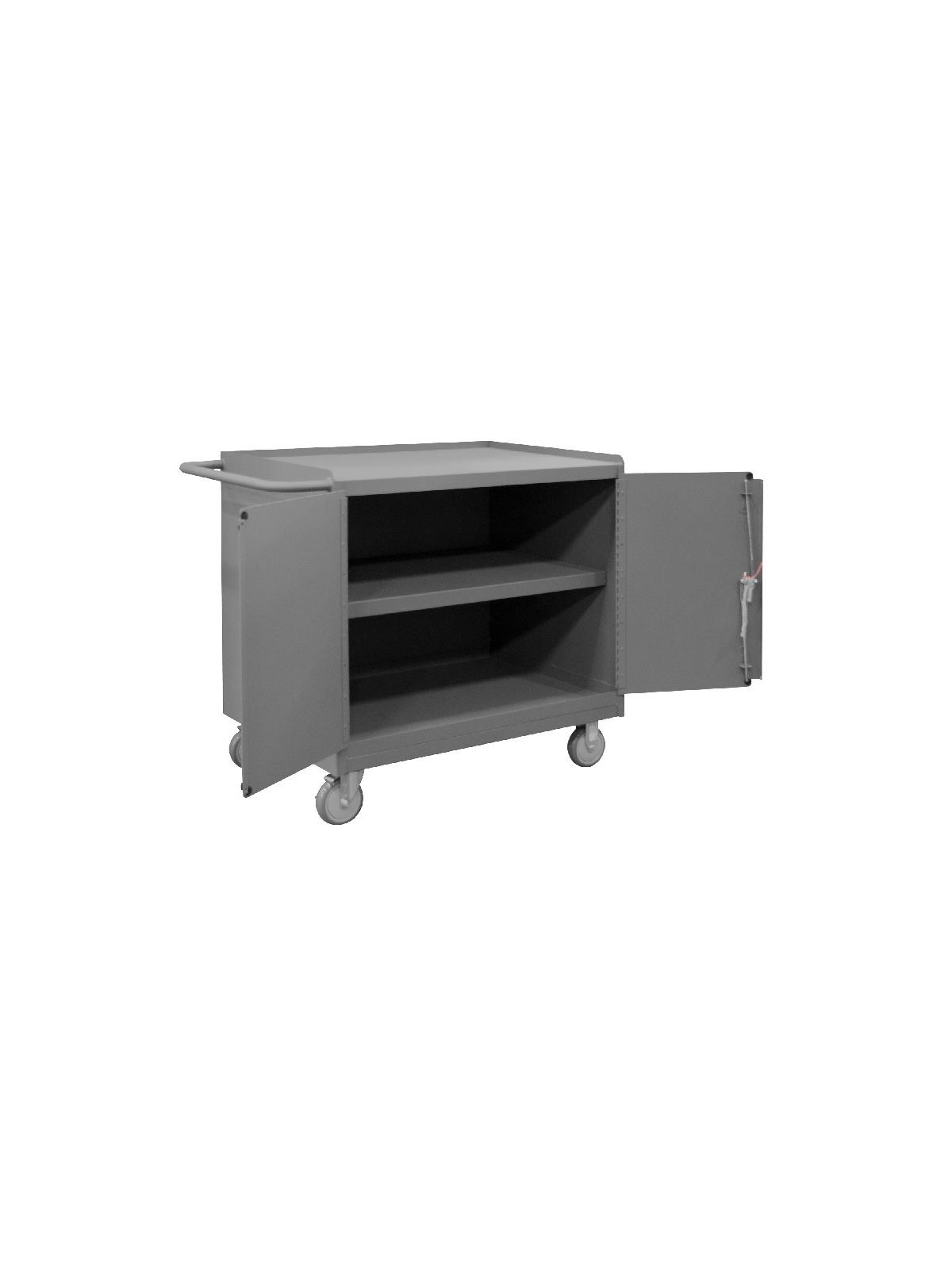 Bench cabinets are constructed of 14 gauge steel. Convenient sturdy work surface with back and end stops on the work surface prevents parts from falling off during transport (MT units not included). Tubular handle for easy maneuverability. Cabinet doors have a 3 point locking system with 4 keys. Rolls smoothly on 5" polyurethane bolt-on casters, (2) swivel with side brakes and (2) rigid. 36"W model has 1,200 lbs. capacity. 48"W model has 2,000 lbs. capacity and includes a floor lock to keep the unit in place while you work. FOB Shipping Point.