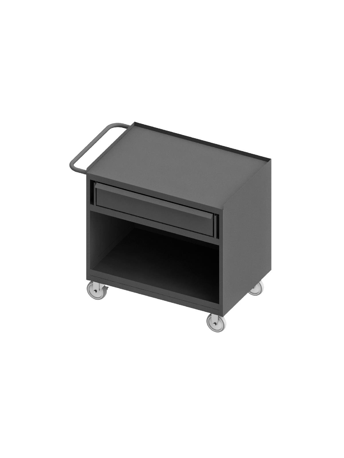Bench cabinets are constructed of 14 gauge steel. Convenient sturdy work surface with back and end stops on the work surface prevents parts from falling off during transport (MT units not included). Tubular handle for easy maneuverability. Cabinet doors have a 3 point locking system with 4 keys. Rolls smoothly on 5" polyurethane bolt-on casters, (2) swivel with side brakes and (2) rigid. 36"W model has 1,200 lbs. capacity. 48"W model has 2,000 lbs. capacity and includes a floor lock to keep the unit in place while you work. FOB Shipping Point.