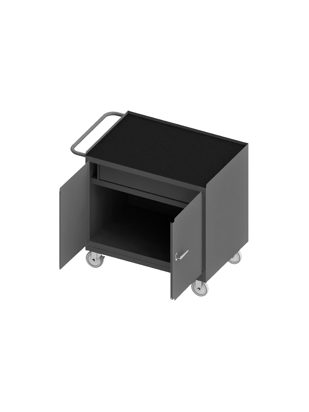 Bench cabinets are constructed of 14 gauge steel. Convenient sturdy work surface with back and end stops on the work surface prevents parts from falling off during transport (MT units not included). Tubular handle for easy maneuverability. Cabinet doors have a 3 point locking system with 4 keys. Rolls smoothly on 5" polyurethane bolt-on casters, (2) swivel with side brakes and (2) rigid. 36"W model has 1,200 lbs. capacity. 48"W model has 2,000 lbs. capacity and includes a floor lock to keep the unit in place while you work. FOB Shipping Point.