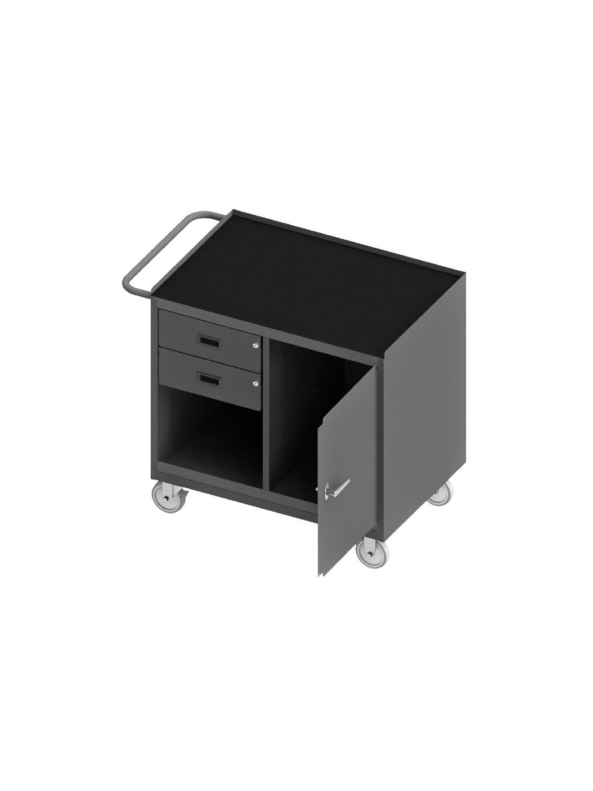 Bench cabinets are constructed of 14 gauge steel. Convenient sturdy work surface with back and end stops on the work surface prevents parts from falling off during transport (MT units not included). Tubular handle for easy maneuverability. Cabinet doors have a 3 point locking system with 4 keys. Rolls smoothly on 5" polyurethane bolt-on casters, (2) swivel with side brakes and (2) rigid. 36"W model has 1,200 lbs. capacity. 48"W model has 2,000 lbs. capacity and includes a floor lock to keep the unit in place while you work. FOB Shipping Point.
