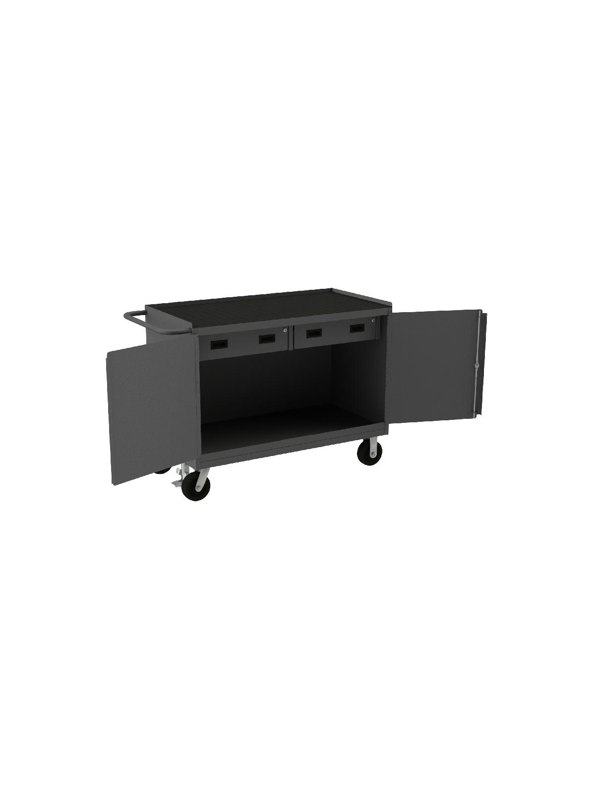 Bench cabinets are constructed of 14 gauge steel. Convenient sturdy work surface with back and end stops on the work surface prevents parts from falling off during transport (MT units not included). Tubular handle for easy maneuverability. Cabinet doors have a 3 point locking system with 4 keys. Rolls smoothly on 5" polyurethane bolt-on casters, (2) swivel with side brakes and (2) rigid. 36"W model has 1,200 lbs. capacity. 48"W model has 2,000 lbs. capacity and includes a floor lock to keep the unit in place while you work. FOB Shipping Point.