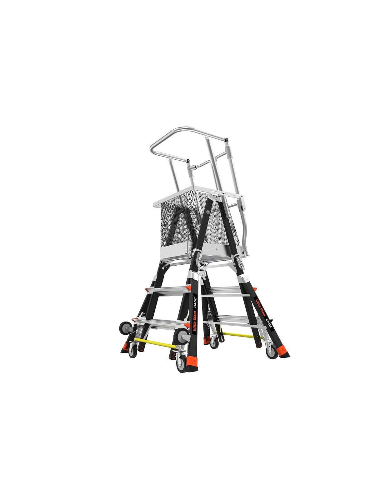 The Cage is constructed of non-conductive, high strength fiberglass-resin composite and is fully adjustable in one-foot increments, allowing the operator to adjust the platform height to the job at hand. Each side adjusts independently, so operators can also use the Cage over uneven surfaces or stairs, where a mechanical lift or ordinary stepladder could never go. The Cage protects operators in a fully enclosed working platform, allowing them to work safely and quickly with two hands while complying with industry regulations. Time and energy saving Tip & Glide™ Wheels make it quick and easy to move from job to job. Type IAA ANSI Duty rating 377 lb. weight capacity. FOB Shipping Point.