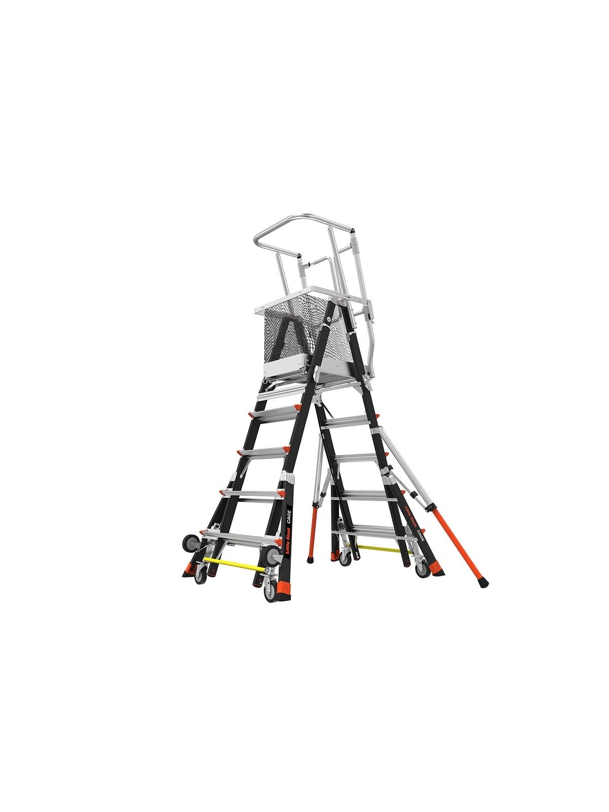 The Cage is constructed of non-conductive, high strength fiberglass-resin composite and is fully adjustable in one-foot increments, allowing the operator to adjust the platform height to the job at hand. Each side adjusts independently, so operators can also use the Cage over uneven surfaces or stairs, where a mechanical lift or ordinary stepladder could never go. The Cage protects operators in a fully enclosed working platform, allowing them to work safely and quickly with two hands while complying with industry regulations. Time and energy saving Tip & Glide™ Wheels make it quick and easy to move from job to job. Type IAA ANSI Duty rating 377 lb. weight capacity. FOB Shipping Point.