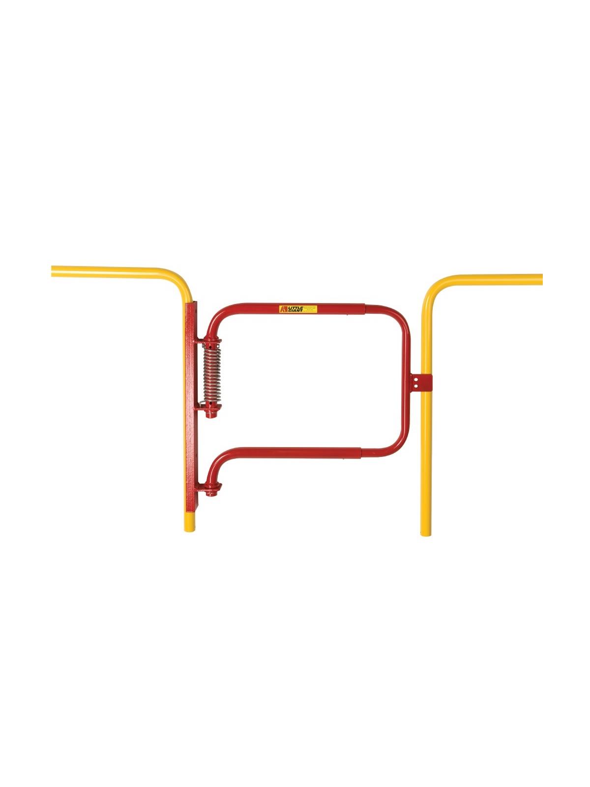 Adjustable width 22-1/2" to 36". Set screws secure at desired width. Stainless steel torsion spring closes the gate automatically. Spring is tension adjustable and reversible. Helps you comply with OSHA 1910.29 requirements. Powder coated red finish (except spring). Outside tubing 1.37" OD x 12 gauge wall. Mounting channel is 2" x 1" with two mounting holes (hardware not included). Gate with easy mount kit makes it easy to mount directly on your existing hand rail. Two bolt together clamps hold unit securely to hand rail. No drilling required. FOB Shipping Point.