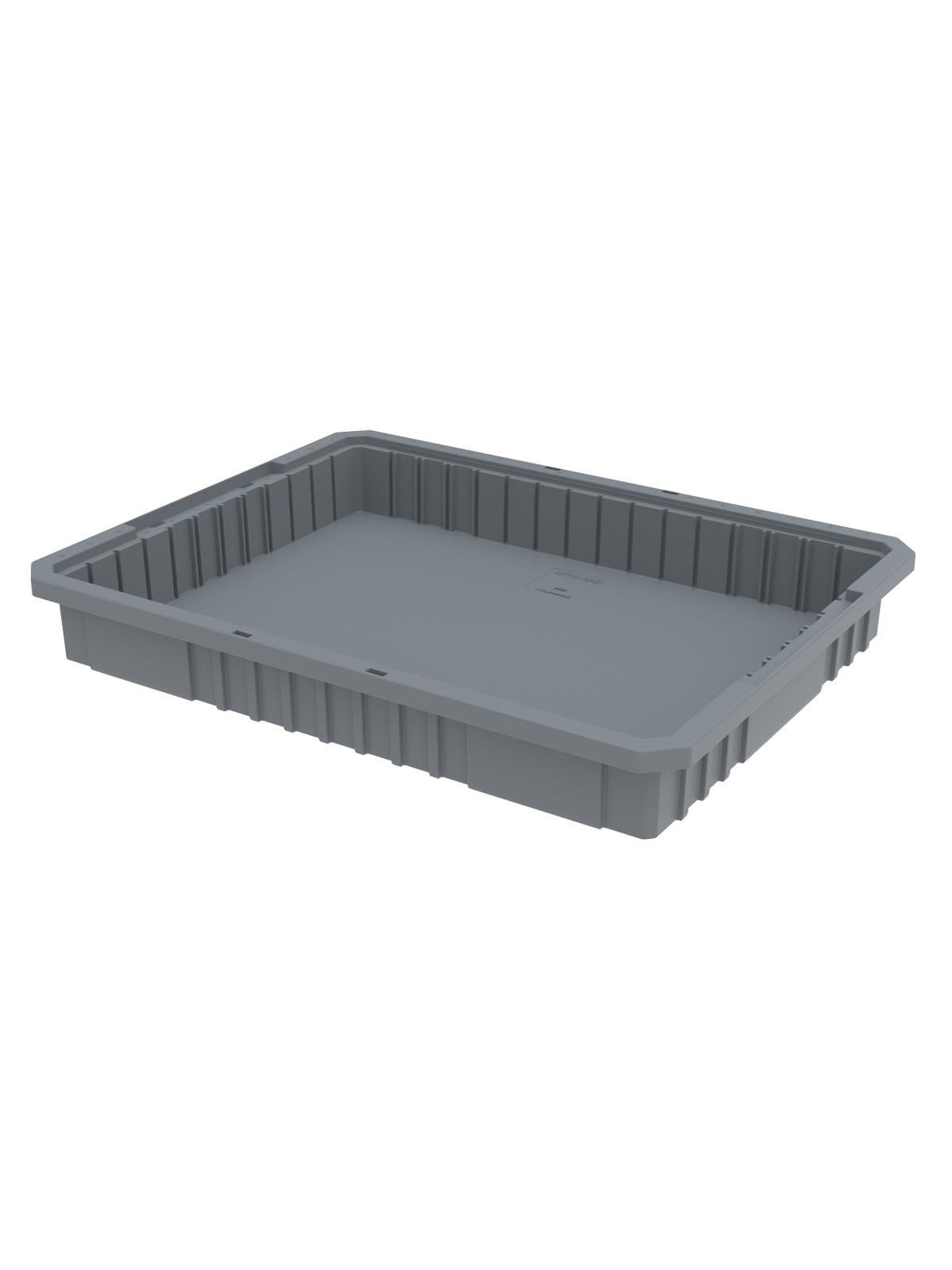 Intersecting dividers allow the container to be subdivided in separate compartments as small as 1-1/8" sq. Injection-molded from high density polyethylene -- resists most solvents and chemicals. Compatible with most racks, shelving and automated material handling equipment. Available in Red, Blue, or Gray. Dividers and lids sold separately. FOB Shipping Point.