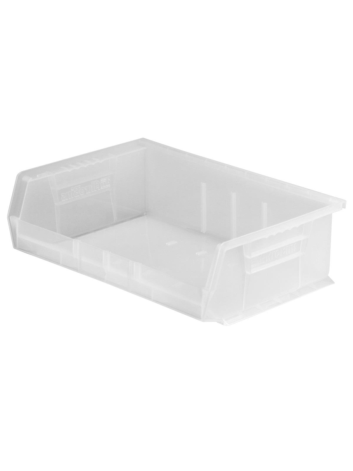 AkroBins are heavy-duty and securely stack on top of each other, sit on shelving, and hang from Akro-Mils racks, panels, rails and carts. Unaffected by weak acids and alkalis the sturdy one piece construction is water, rust and corrosion-proof. Finger grip allows for easy handling. Large label slot for easy identification of contents. Autoclavable up to 250° F. Guaranteed not to crack or break under normal load conditions as stated in the 1-year limited warranty. Optional dividers and labels available, see Related Items tab. AkroBins available in Red, Yellow, Blue, Green, Black, Stone, and Semi-Clear. FOB Shipping Point.