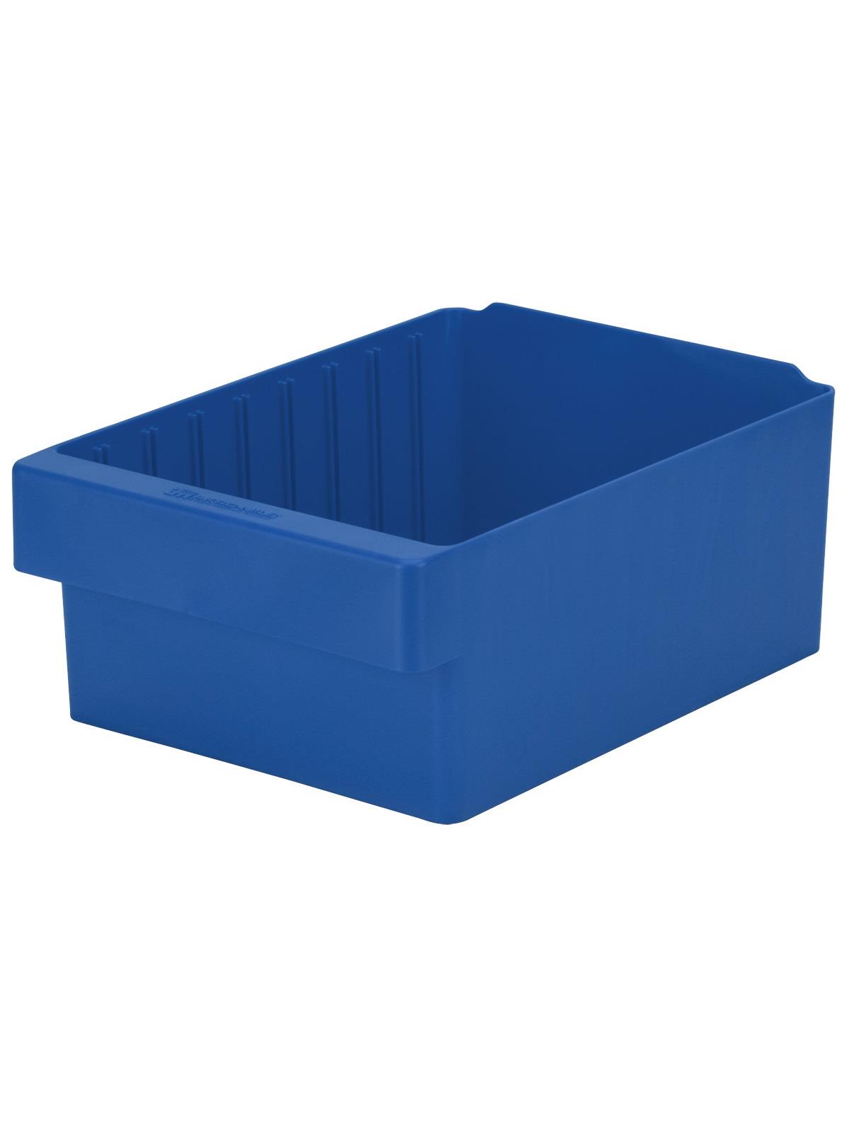 Offered in 12" or 18" depths to work with compatible shelving. Easy to label and color code inventory for quick identification of parts and supplies. Drawers can be stacked to optimize space. Wide front handle for easy gripping when AkroDrawers are loaded or contain heavy contents. Can be used with available shelving, racks, mobile carts or can be used by themselves. Sturdy back stop tab ensures AkroDrawers can hang securely from shelves. Dividers are available to keep contents neatly separated in drawers. Available in Blue, Gray, Yellow, Red and Clear - Minimum order required. FOB Shipping Point.