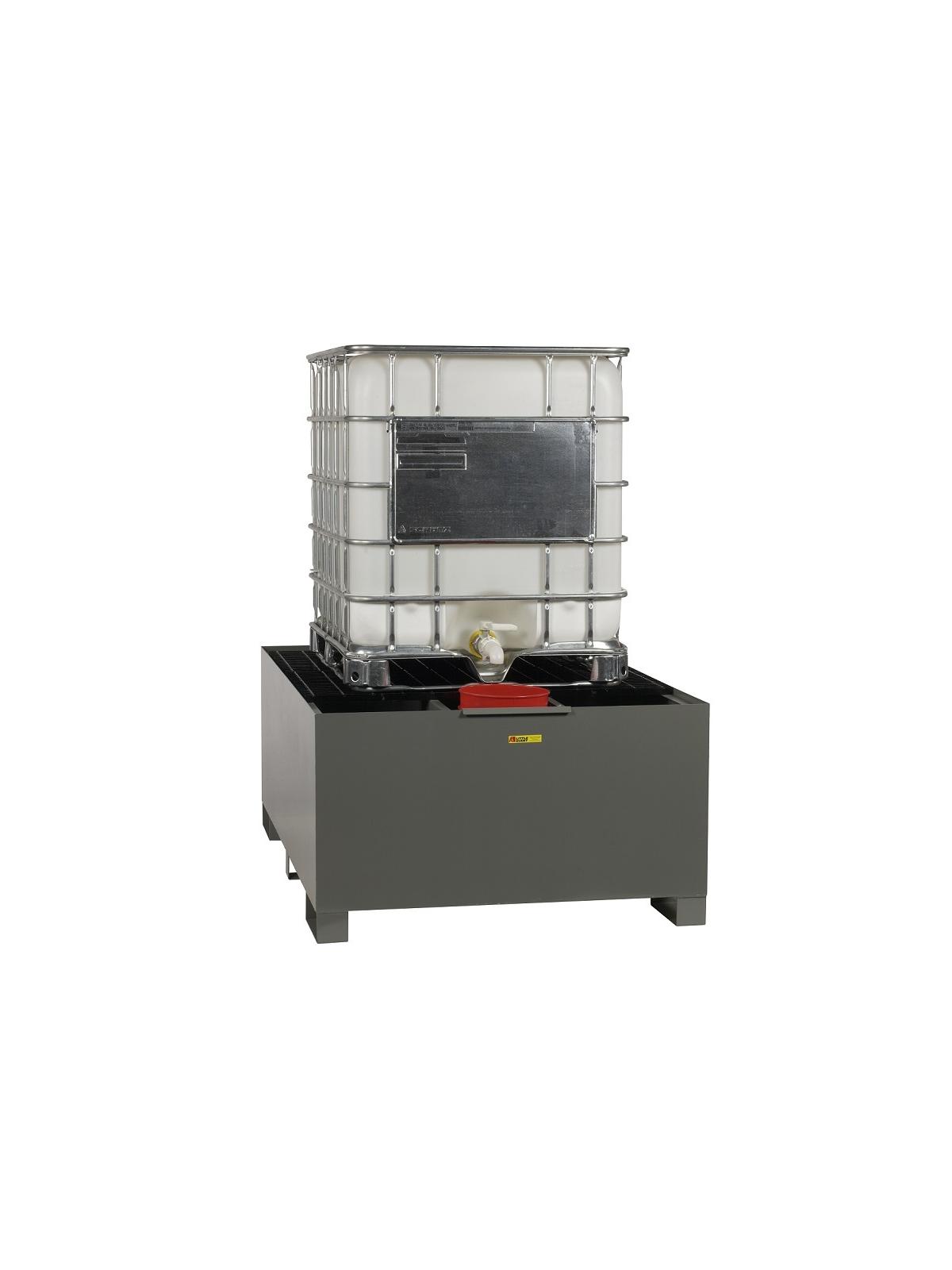 Heavy gauge steel construction for durability and extended life. Steel grating deck panels are easily removed for cleaning. Includes drain plug and grounding screw. Helps you comply with EPA requirements. Single IBC Unit has a large deck surface for additional storage. Three-piece steel grating deck is 29" high. "Convertible" deck allows IBC to be positioned for dispensing within sump area. Included pail holder shelf attaches conveniently to inside or outside of sump. Double IBC Unit can store 2 IBC's side by side, and has a lower profile for easier access. Four piece removable grating deck is 23" high. Includes 2 removable pail holder shelves. FOB Shipping Point.