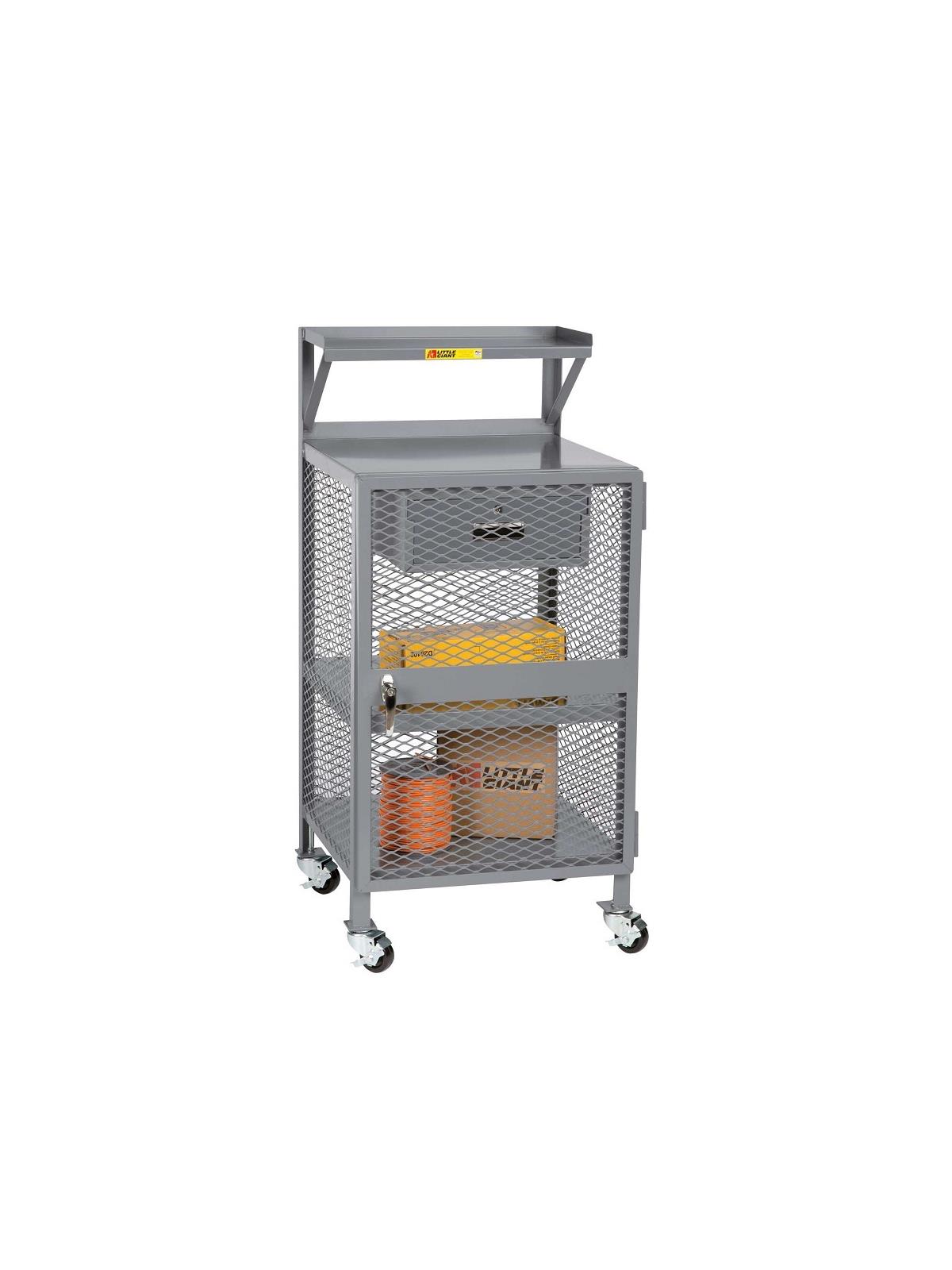 All-welded construction with comfortable height as a standing desk/workstation. Riser shelf is 10" deep and 10" above desk surface. Locking storage drawer is 13"W x 17"D x 4-1/2"H and comes with two keys. Lower shelves have 1-1/2" retaining lips and 11-3/4" shelf clearance. FOB Shipping Point.