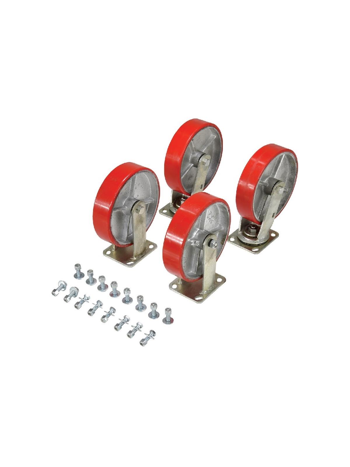 For use with Bumper Release Steel Hoppers. Transport loads with portable hoppers. The maximum weight capacity is the lowest weight capacity of either the hopper or the caster. Casters are shipped uninstalled to prevent freight damage. Sets include (2) rigid, and (2) swivel casters. Casters are bolted-on by utilizing the factory stamped hole in the fork tubes. FOB Shipping Point.
