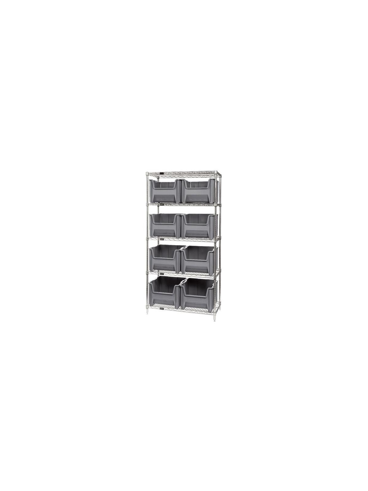 Combine stylish chrome shelving and parts organizing bins. Sturdy shelving unit supports loads up to 800 lbs. Choice of bins. Easy to assemble. Giant Hopper Bins are available in Gray, Blue, or Red. FOB Shipping Point.