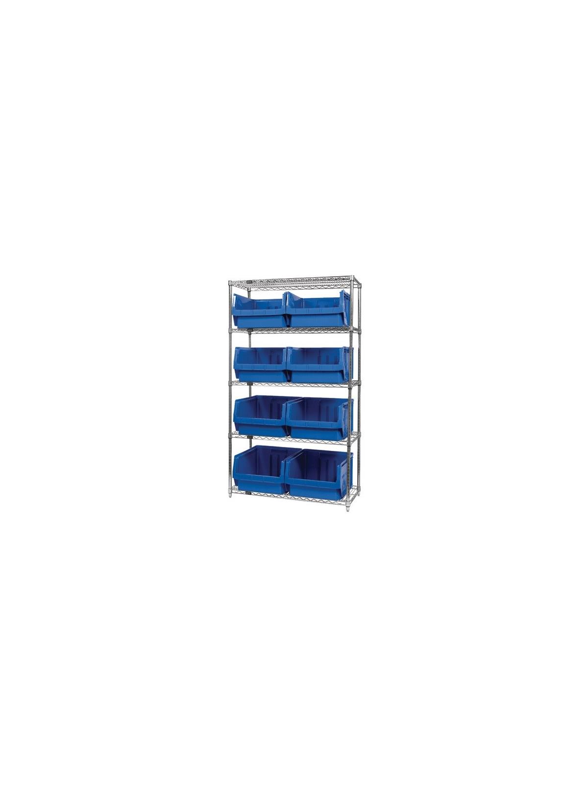 Combine stylish chrome shelving and parts organizing bins. Sturdy shelving unit supports loads up to 800 lbs. Choice of bins. Easy to assemble. Magnum Bins are available in Blue, Yellow, Green, Red, or Black. FOB Shipping Point.