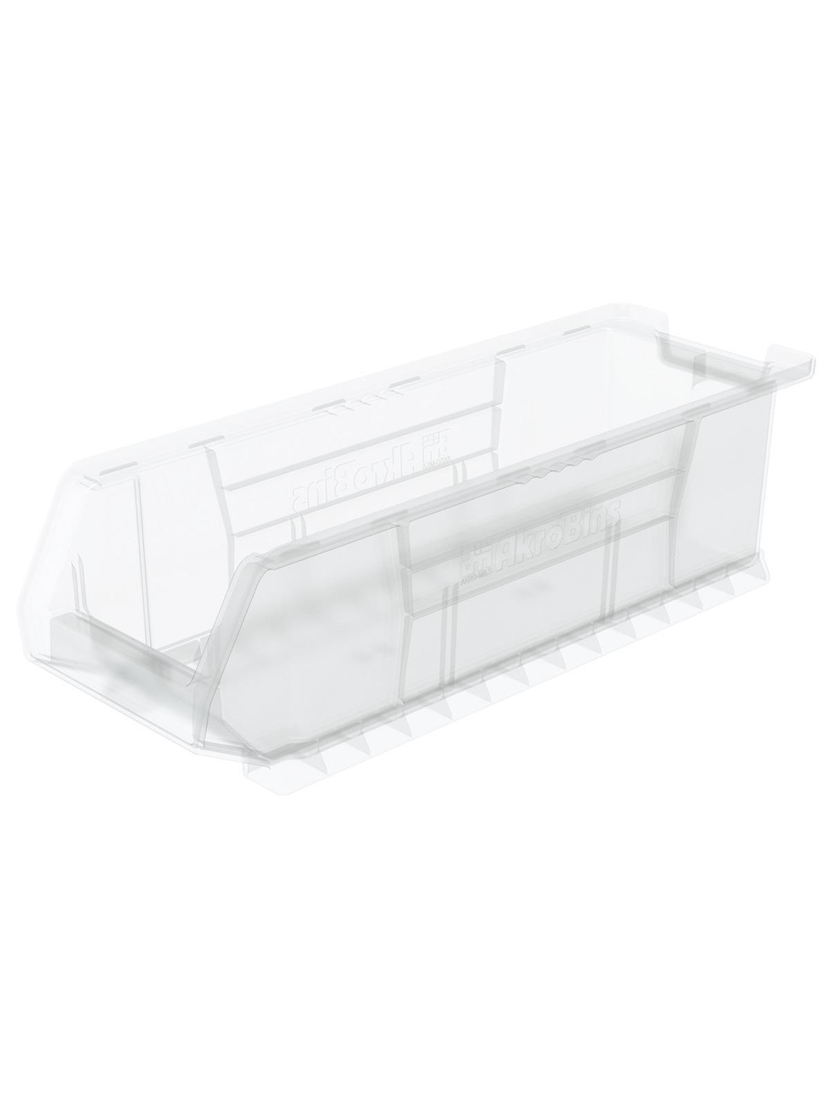 20", 24" and 30" Deep Clear Bins for Super-Size Storage. Large capacity storage bins for organizing heavy or bulky items. Heavy-duty bins molded in clear polypropylene. Extra large stacking containers feature anti-slide stop to prevent bins from shifting forward. Reinforced side ribs add strength and prevent spreading when stacked or loaded. Optional lids and dividers available. FOB Shipping Point.