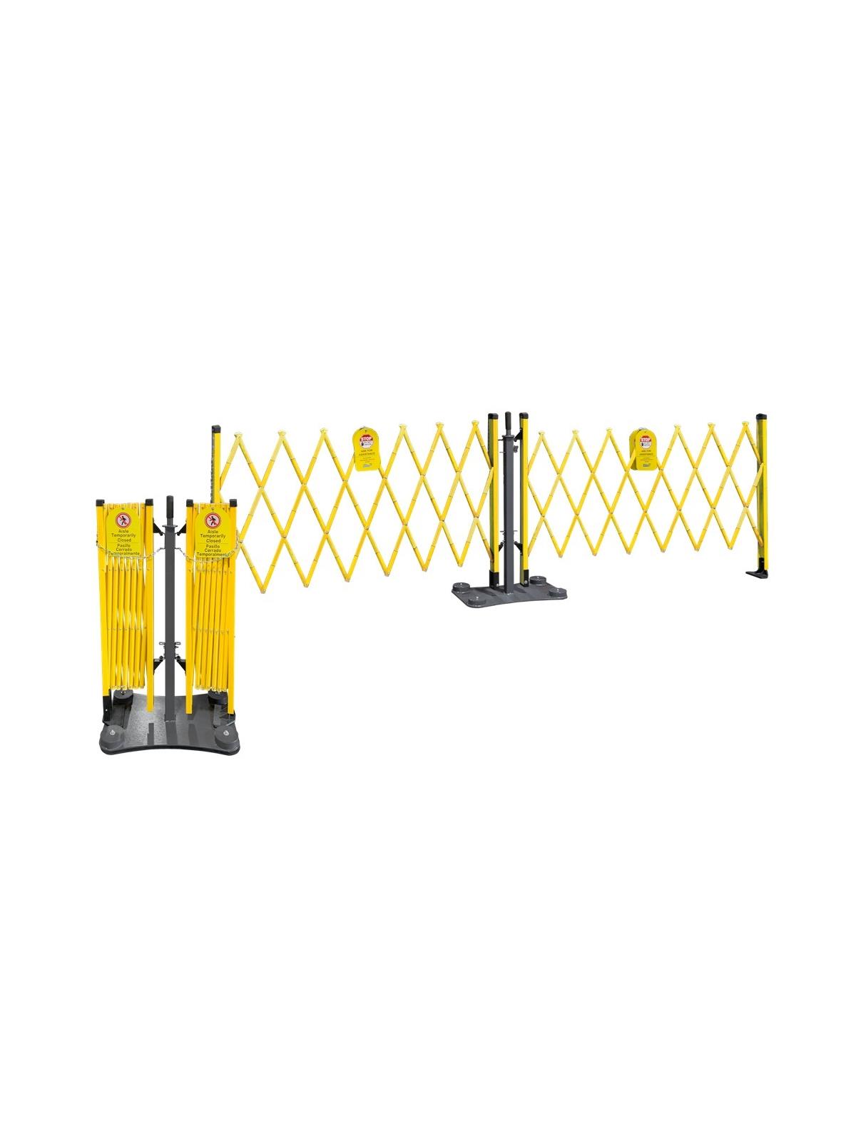 The Pedestal Double Gate combines two fiberglass safety gates with a steel central pedestal base. Fully expanded, the gates and pedestal cover over 24' of aisle and each gate is capable of being independently articulated up to 90 degrees to close off areas with a right angle. When collapsed, the gates rest entirely on the pedestal, which features four 2" swivel casters and an ergonomic handle so that the entire unit can be rolled in and out of place for easy deployment. FOB Shipping Point.
