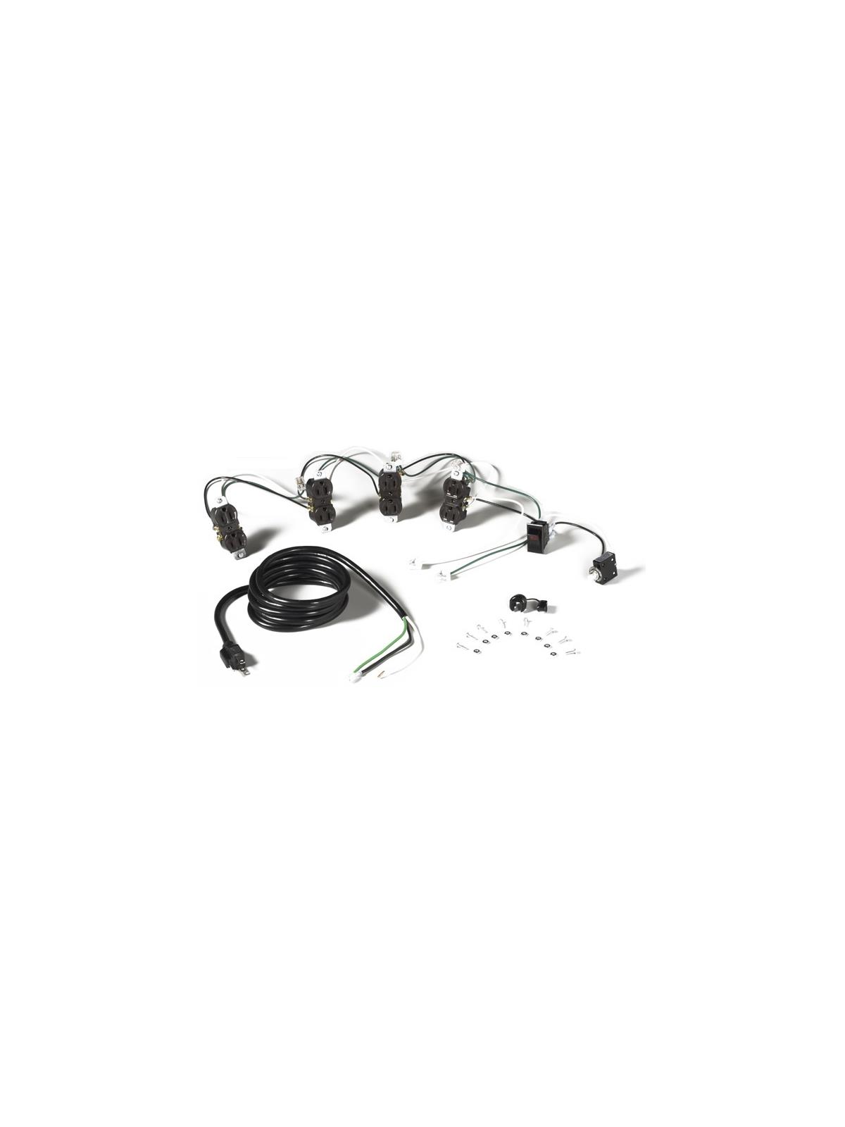 Pre-wired for quick and easy installation. Comes complete with 4 duplex receptacles, on/off switch with pilot light, 8" grounded cord and plug, 15 amp, 115V service and circuit breaker. For use in workbenches and risers.