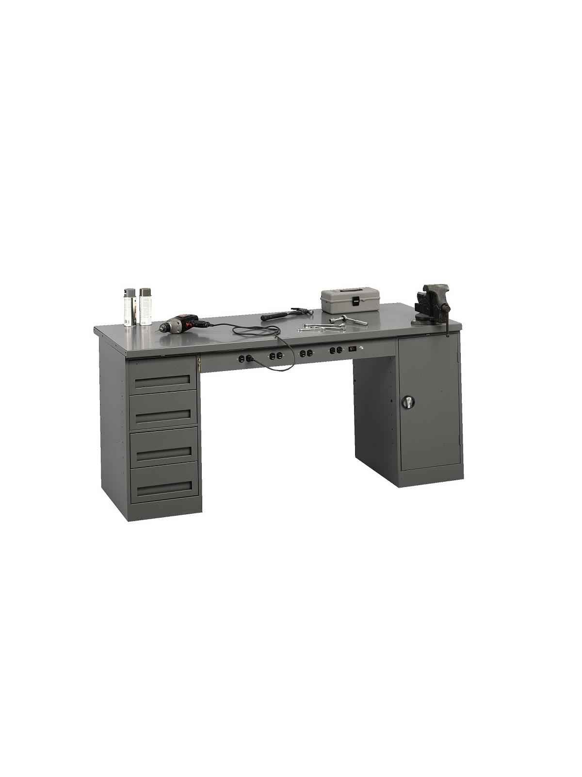 Drawers have an adjustable divider.  Full depth shelf in door cabinet is adjustable in 1-1/8" increments. Front panel has knockouts for four duplex outlets and a switch (order optional wiring kit - See Related Items tab). Choice of tops: 1-3/4" thick solid hardwood butcher-block top or 1-1/2" thick steel top. Shipped unassembled (cabinets may be installed on either side). Medium gray. FOB Shipping Point.