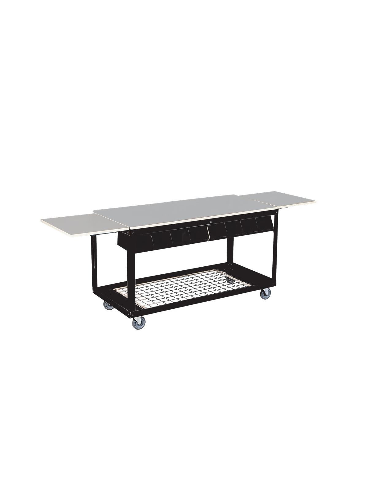 Description Work Table with drop leaves, 8 organizer bins, bottom grid shelf, and 4" heavy-duty casters (2 swivel/2 brake)