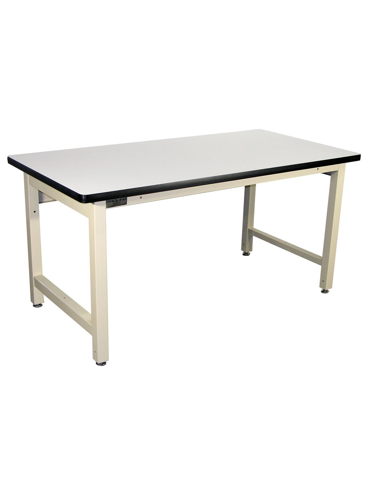 Handsome work station provides efficient pull-pin height adjustment. Industrial grade features include 16 ga. 2" square legs, 2" thick front and 8" thick back rails. Safely handles 1000 lb capacity loads.