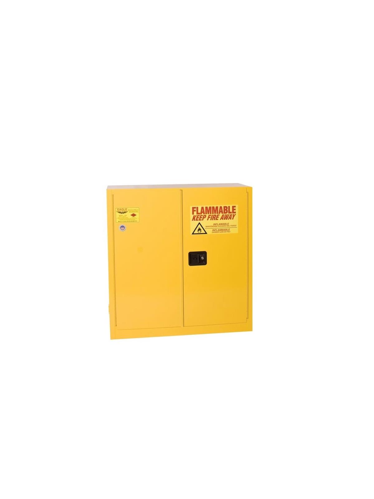 Eagle flammable storage cabinets come in yellow high gloss powder finish with red warning, grounding attachment, 3-point key lock, and 2-inch raised leakproof door sill. Each shelf is adjustable, supported by four brackets, and can support 350 pounds. All our metal cabinets meet NFPA Code 30 and OSHA requirements. Flammable cabinets help keep flammable liquids near work areas safely. Constructed of 18-gauge steel, all cabinets feature reinforced double-wall construction with air space on the sides, top, bottom, back and doors. Flammable cabinets, also known as fire cabinets, come in standard design, tower cabinets with legs, wall mounted cabinets, under counter cabinets, and add-on cabinets. FOB Shipping Point.