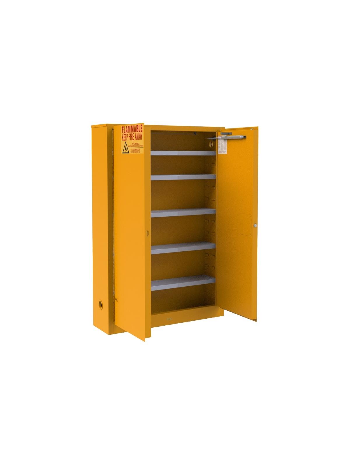 Flammable Storage Cabinets are required by OSHA and UFC in commercial and industrial facilities where flammable liquids are used and stored. Cabinets feature recessed lockable paddle latch and 3 point locking systems which greatly improves security. Bunged air vents on each side of the cabinet allows for greater ventilation. Constructed of all welded Heavy Duty Steel.