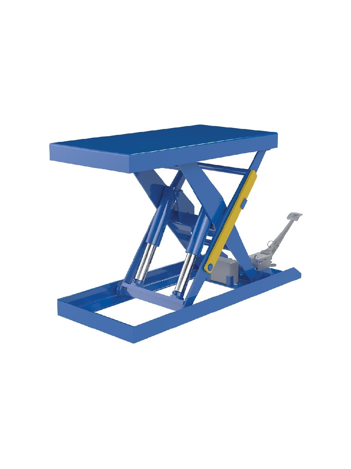Foot Pump Scissor Lift Tables are used by all types of manufacturing and warehousing facilities. Features torsion tubes for side to side stability, pressure flow control valve for controlled lowering, and foot pump. Rugged welded steel construction. Painted blue finish. FOB Shipping Point.