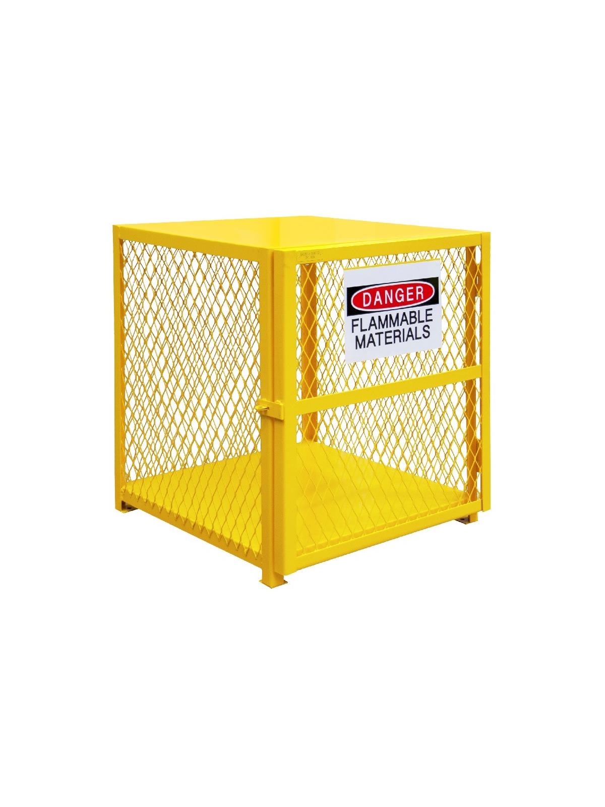 Lockable cabinets store cylinders of fuel, LP gases and other flammable materials on easy-to-access cylinder cradles. "DANGER FLAMMABLE MATERIALS" signs on each door. Magnetic catch keeps doors safely shut when not locked. Heavy-duty butt hinges keep doors from sagging. Includes padlock hasp to secure contents - padlock not furnished. Made of sturdy 1-1/2" x 1/8" angle iron frame. Pre-drilled holes for lagging to floor. Durable, rust and acid resistant safety Yellow powder coat finish. When used properly, units are in full compliance with OSHA and NFPA standards. FOB Shipping Point.