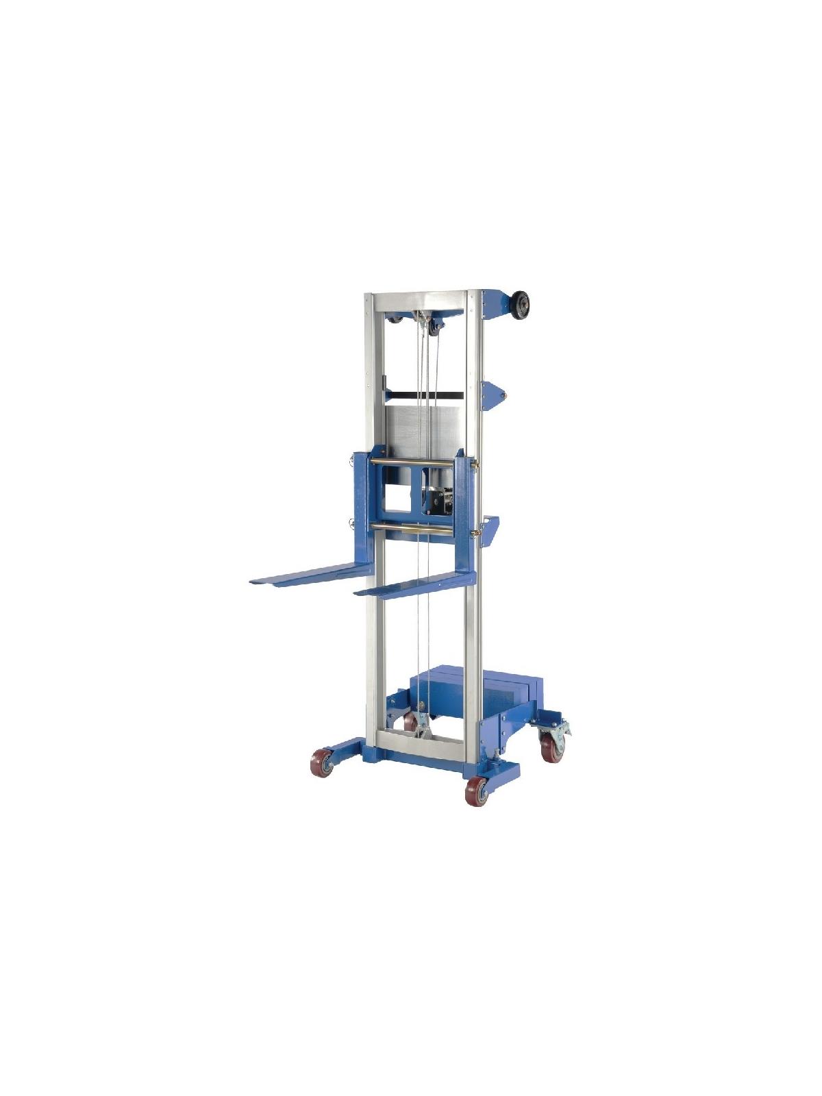 Operated by a hand-crank winch that features a reversible handle and a hold-down device for securing the carriage during transport. Forks can be inverted to provide 2 different heights. Rugged thick steel forks are 4"W x 1-3/4" thick and forks measure 20-1/2"W x 22"L overall. Truck is made of durable steel-and-aluminum. Two 8" non-marking rear wheels, two 2" front swivel casters. Counter balanced design has poly-on-poly wheels, (2) 5" rear swivel wheels, (2) 4" front wheels. Models ending with 'HP' and 'EHP' suffixes have extended height capabilities. These units have a 2 stage mast system and a telescoping inner mast frame, giving the user the ability to extend the forks above the height of the first mast. FOB Shipping Point.