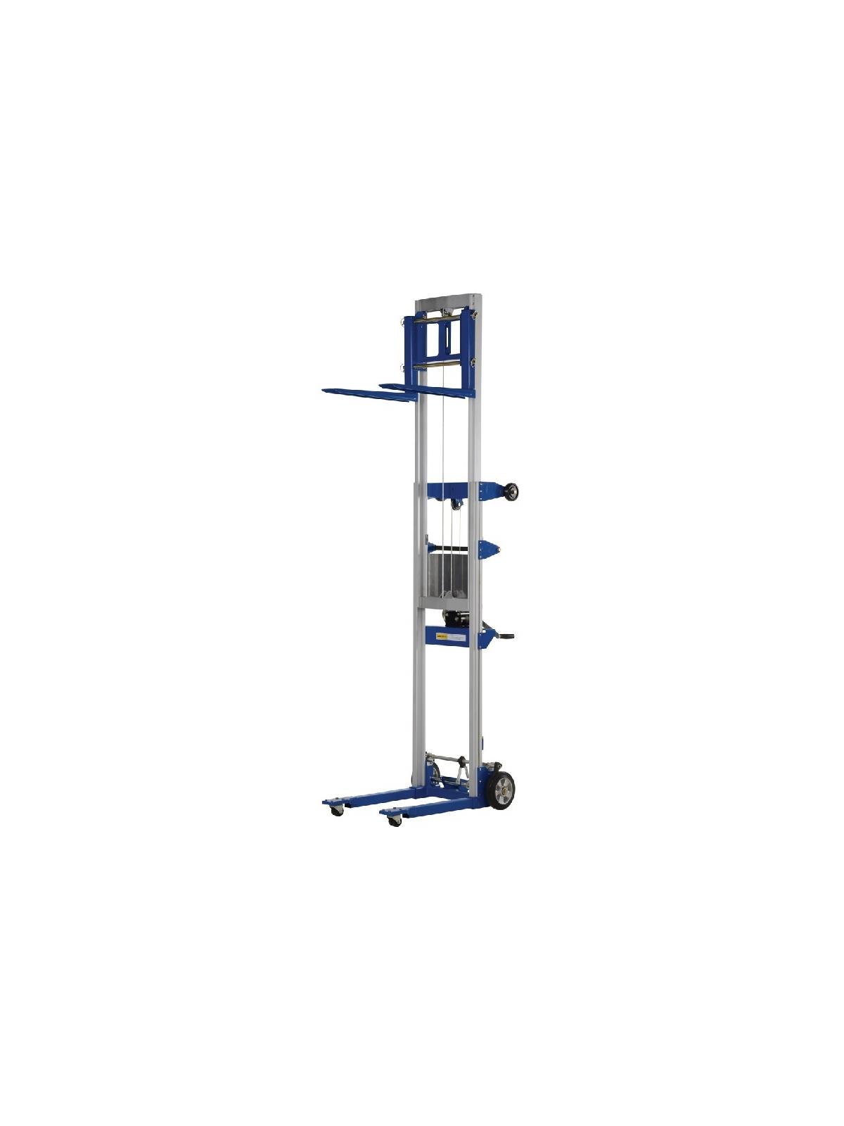 Operated by a hand-crank winch that features a reversible handle and a hold-down device for securing the carriage during transport. Forks can be inverted to provide 2 different heights. Rugged thick steel forks are 4"W x 1-3/4" thick and forks measure 20-1/2"W x 22"L overall. Truck is made of durable steel-and-aluminum. Two 8" non-marking rear wheels, two 2" front swivel casters. Counter balanced design has poly-on-poly wheels, (2) 5" rear swivel wheels, (2) 4" front wheels. Models ending with 'HP' and 'EHP' suffixes have extended height capabilities. These units have a 2 stage mast system and a telescoping inner mast frame, giving the user the ability to extend the forks above the height of the first mast. FOB Shipping Point.
