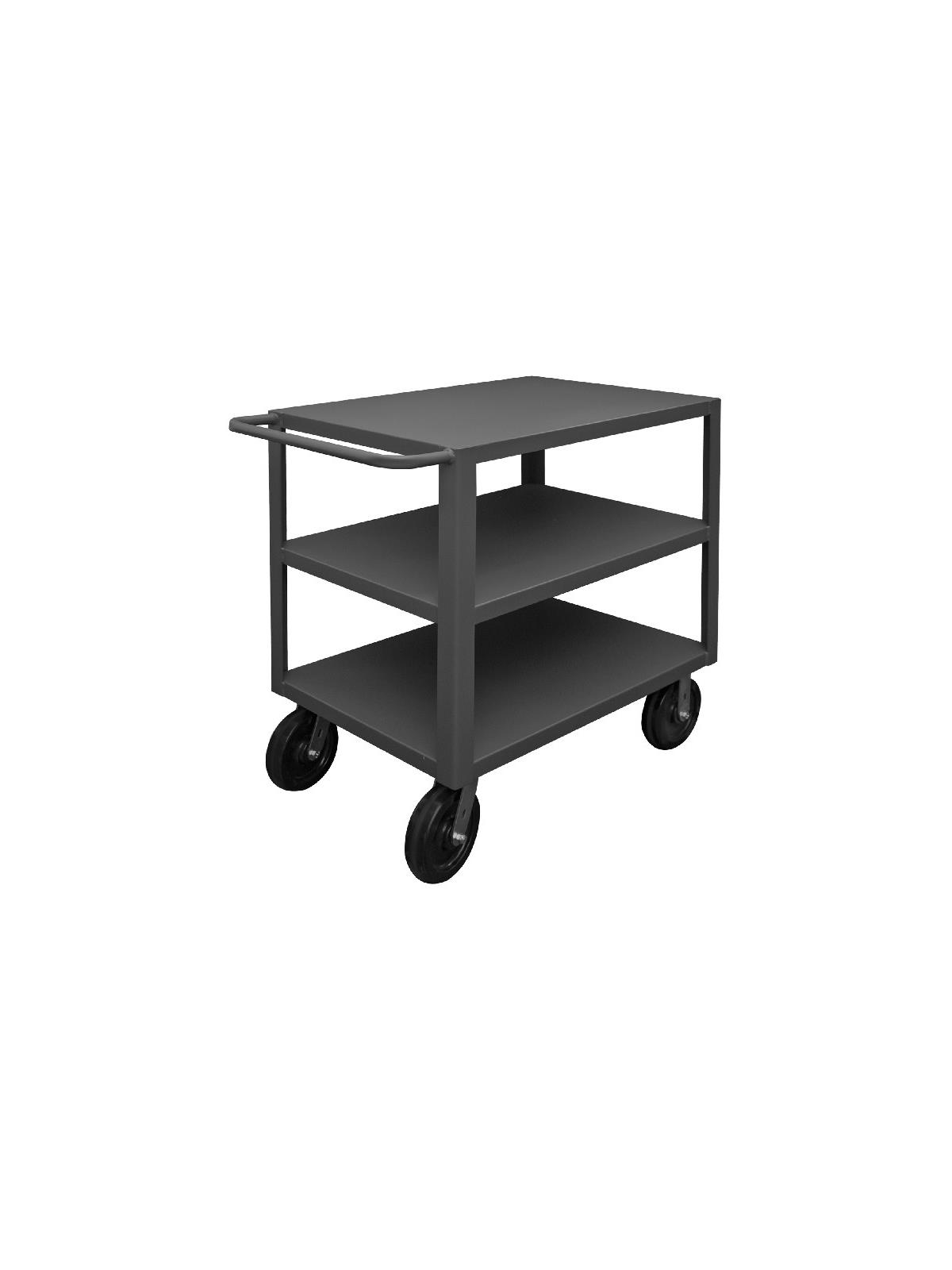 Heavy Duty Portable Tables have a 2" x 3/16" angle iron frame for added strength. Shelves are reinforced and have lips down. (2) swivel and (2) rigid bolt-on casters. Sturdy tubular push handle for easy maneuverability. 4,000 lbs. capacity unit has welded 14 gauge steel shelves with channel formed sides. 5,000 lbs. capacity unit has welded 12 gauge steel shelves. FOB Shipping Point.