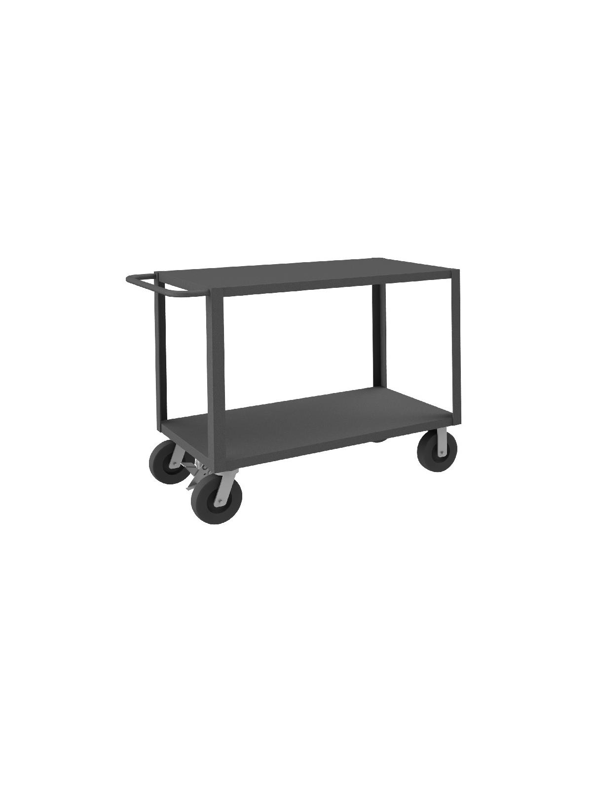 Heavy Duty Portable Tables have a 2" x 3/16" angle iron frame for added strength. Shelves are reinforced and have lips down. (2) swivel and (2) rigid bolt-on casters. Sturdy tubular push handle for easy maneuverability. 4,000 lbs. capacity unit has welded 14 gauge steel shelves with channel formed sides. 5,000 lbs. capacity unit has welded 12 gauge steel shelves. FOB Shipping Point.