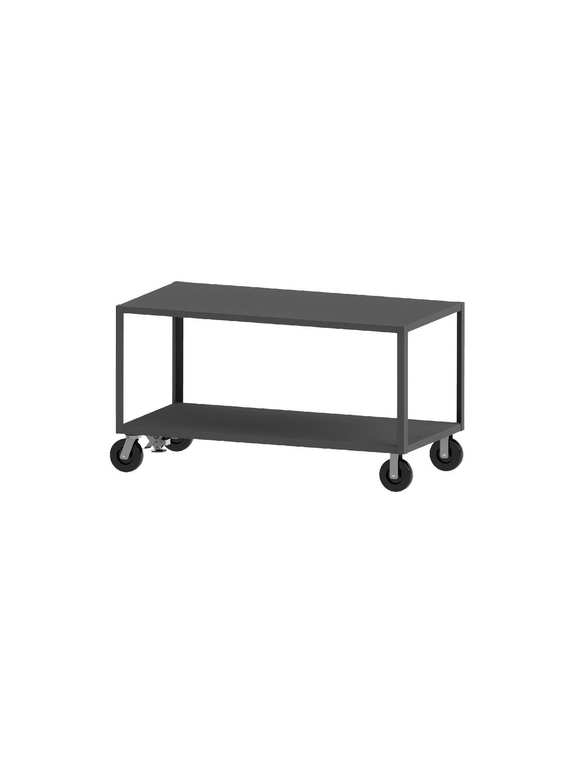 Heavy Duty Portable Tables have a 2" x 3/16" angle iron frame for added strength. Shelves are reinforced and have lips down. (2) swivel and (2) rigid bolt-on casters. Sturdy tubular push handle for easy maneuverability. 4,000 lbs. capacity unit has welded 14 gauge steel shelves with channel formed sides. 5,000 lbs. capacity unit has welded 12 gauge steel shelves. FOB Shipping Point.