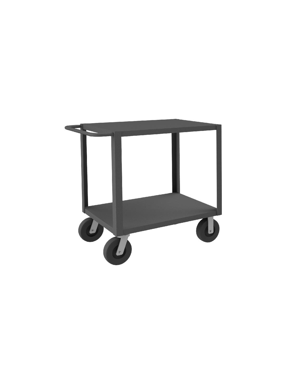 Heavy Duty Portable Tables have a 2" x 3/16" angle iron frame for added strength. Shelves are reinforced and have lips down. (2) swivel and (2) rigid bolt-on casters. Sturdy tubular push handle for easy maneuverability. 4,000 lbs. capacity unit has welded 14 gauge steel shelves with channel formed sides. 5,000 lbs. capacity unit has welded 12 gauge steel shelves. FOB Shipping Point.