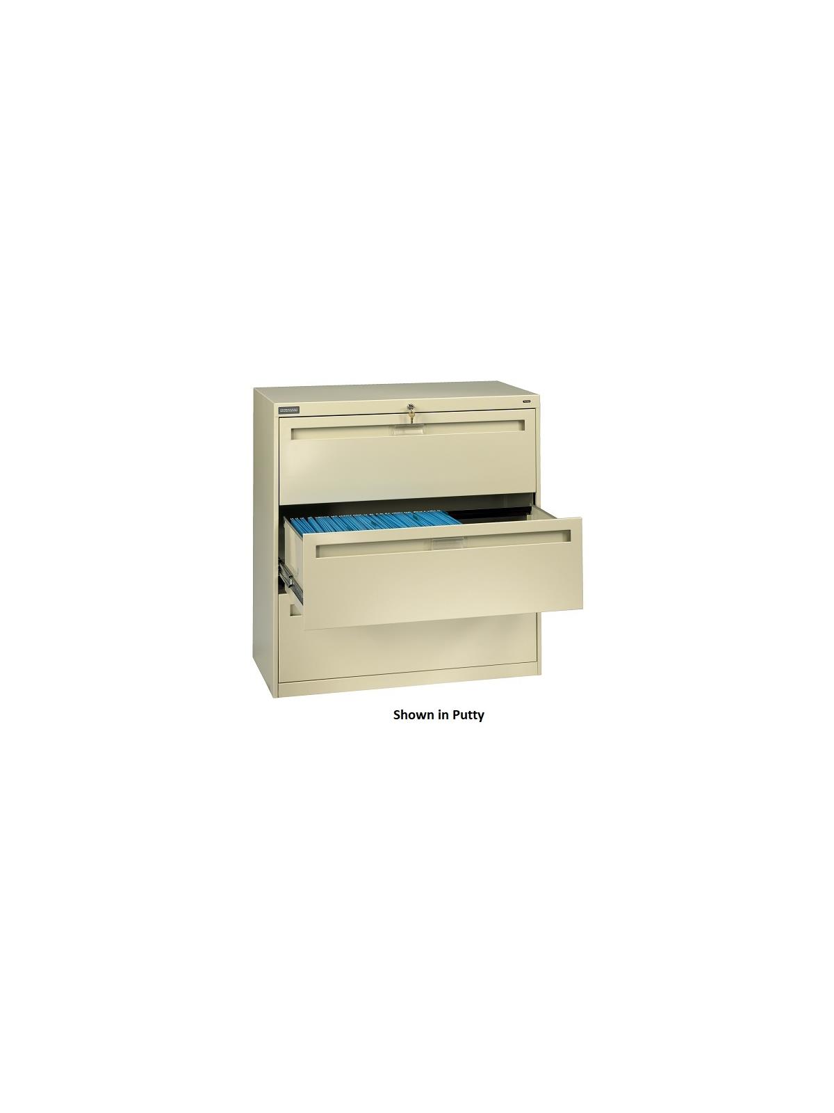Drawers and doors have easy grip, full-width pulls with recessed label holders. Four leveling glides allow the unit to be leveled on uneven floors. To reduce risk of tipping, order two drawer lateral files with counterweights (suffix "W") for all applications except under a work surface in a workstation. Five and six-high units have retractable door(s) with roll-out drawer on top opening(s). Durable powder-coat paint finish. Available in Light Gray, Medium Gray, Putty, Sand and Black. FOB Shipping Point.