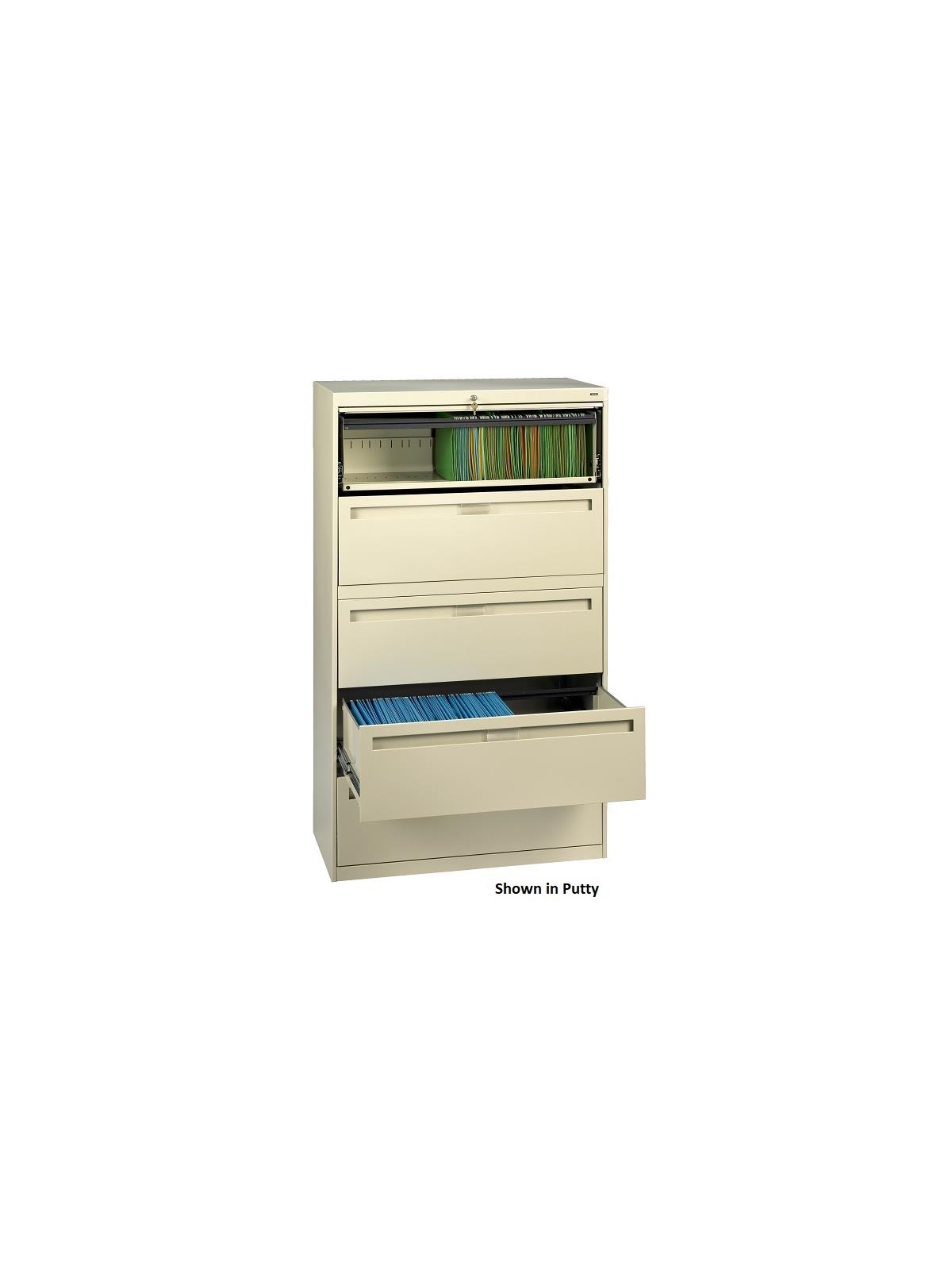 Drawers and doors have easy grip, full-width pulls with recessed label holders. Four leveling glides allow the unit to be leveled on uneven floors. To reduce risk of tipping, order two drawer lateral files with counterweights (suffix "W") for all applications except under a work surface in a workstation. Five and six-high units have retractable door(s) with roll-out drawer on top opening(s). Durable powder-coat paint finish. Available in Light Gray, Medium Gray, Putty, Sand and Black. FOB Shipping Point.