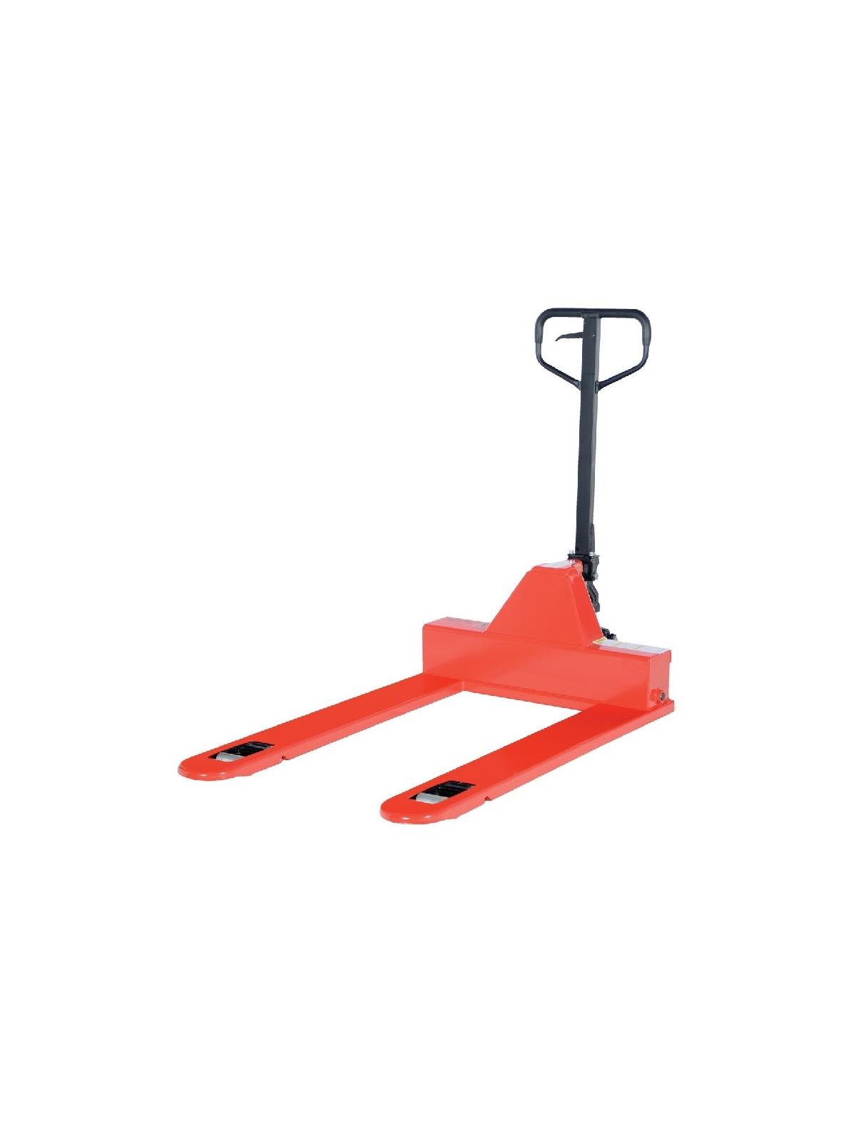 Steering wheels include precision bearing and dust covers for added life. Nose wheels are located on the front edge of each fork to assist in clean pallet entrance and exit. 2 entry wheels facilitate easy entry and 2 exit rollers make disengagement much smoother. Reinforced triple-formed forks. Internally mounted solid steel adjustable push rods. Spring loaded loop handle automatically returns to vertical position when not in use. Hydraulic pump design facilitates easy-access seal replacement. Chrome plated hydraulic pump piston for long seal life. Red baked-in powder-coated toughness. FOB Shipping Point.