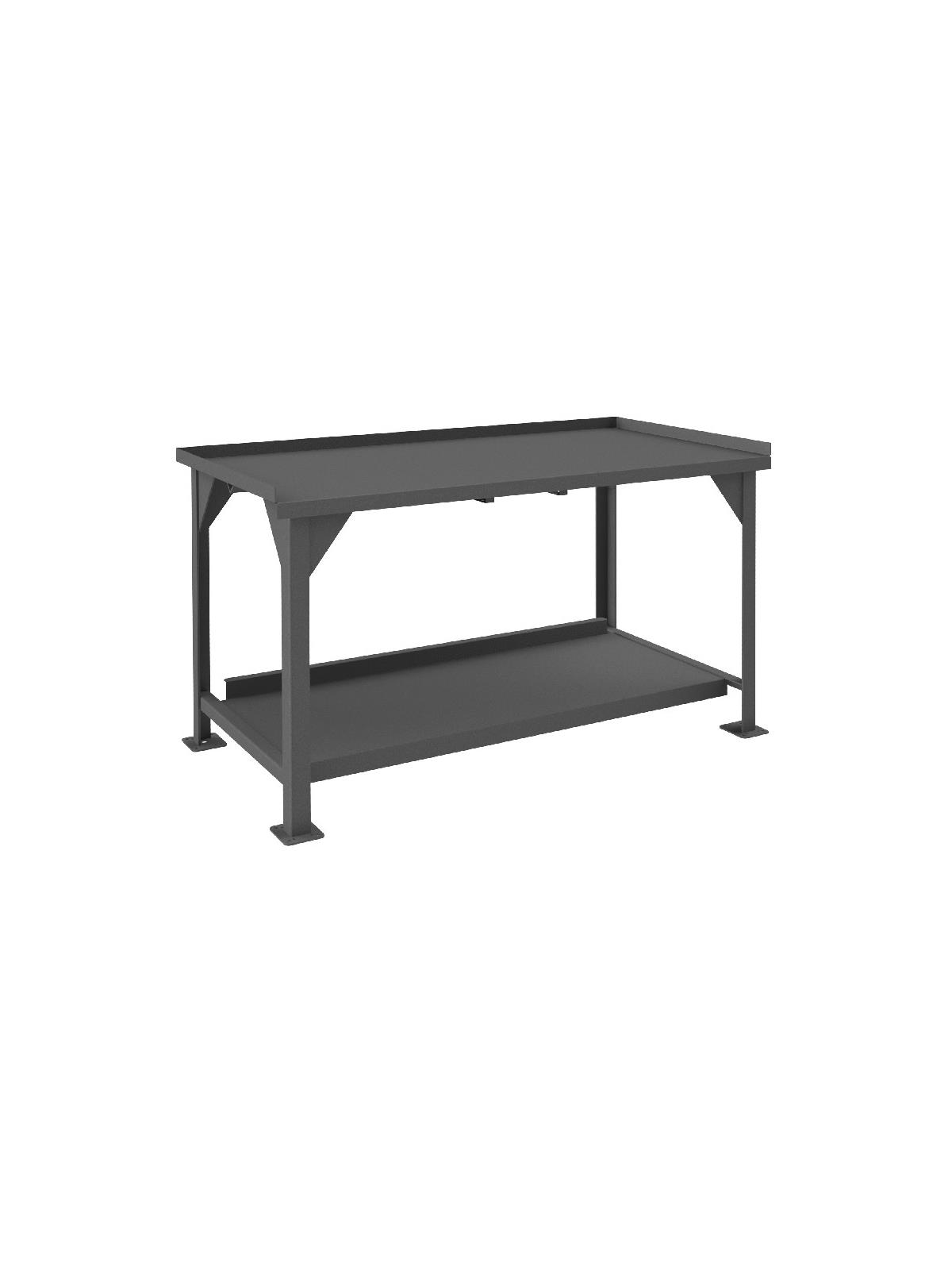 Workbench top is 12 gauge thick reinforced steel. Has angle iron stiffener under work surface and 2" x 2" x 1/4" angle iron legs. Mobile units (DWBM) include (4) 3" phenolic, locking swivel casters. Back and end stops. All units have provisions for optional drawer to be added. Work surfaces are 34" above the floor. All models include a 12 gauge steel lower shelf with 500 lbs. capacity. Foot pads with predrilled holes allow for lagging to the floor. FOB Shipping Point.