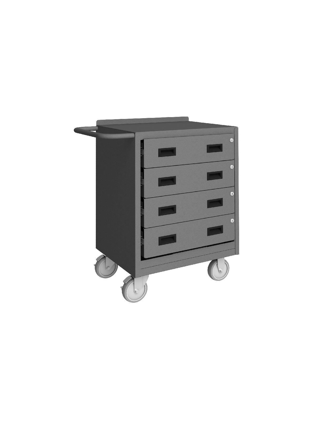 Unit features back and end stops on the work surface. Bolt-on 5 x 1-1/4" polyurethane casters, 2 swivel and 2 rigid with side brakes. Cabinet compartment comes equipped with one adjustable shelf and a keyed handle with 3 point locking system. Models with -TH in the part number include a work surface with 1/4" thick tempered hardboard. Drawers measure 20-7/16" W x 14-11/16" D x 5-7/8" H. Ships fully assembled and ready to use. FOB Shipping Point.