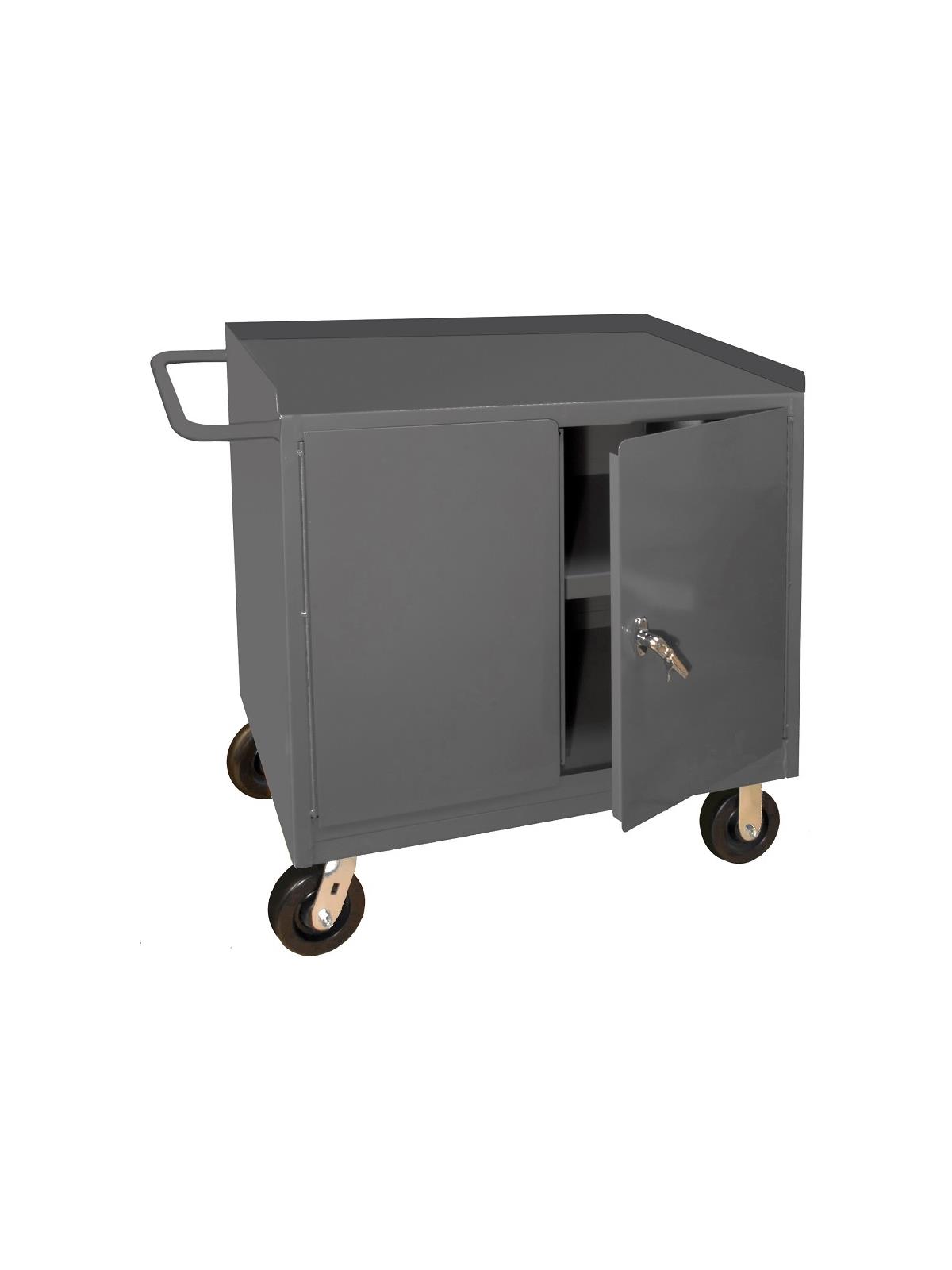 Choose from two models to store, sort and organize. High capacity, heavy-duty mobile cabinets combine storage, security, mobility and a work surface. Ideal for factories, warehouses or offices. Doors swing effortlessly, thanks to full length piano hinges. Doors also feature three-point locking handle and two keys. Casters are 6" x 2" phenolic bolt-on, two swivel and two rigid. Capacity of 2,000 lbs. Gray powder coat finish. FOB Shipping Point.