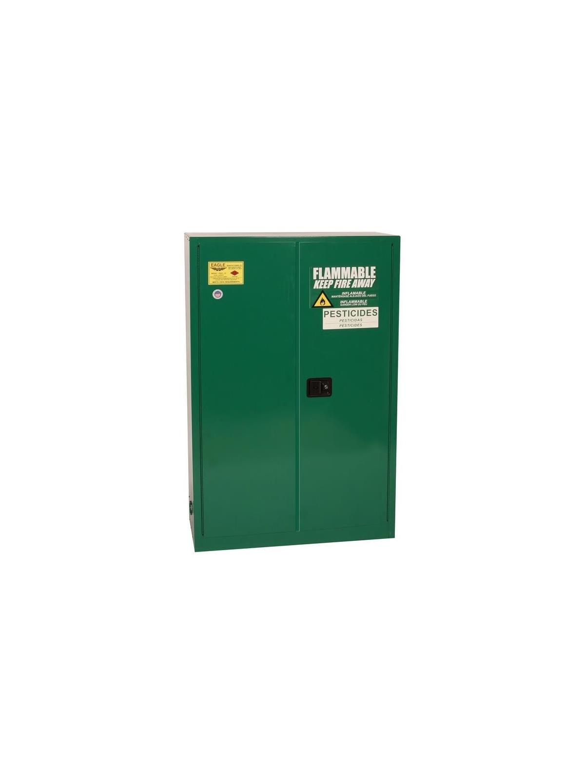 Eagle safety pesticide cabinets provide needed security for companies specializing in lawn care, golf course management, agricultural interests, and individuals who handle and store pesticides and poisons. The pesticide safety cabinets are constructed of 18-gauge steel and feature reinforced double-wall construction with air space on sides, top, bottom, back, and doors. The cabinets are coated with a lead-free, high gloss, baked-on powder finish for superior protection against chemical corrosion with large FLAMMABLE- KEEP FIRE AWAY and pesticide labels. All of our durable pesticide cabinets are FM-Approved and meet NFPA Code 30 and OSHA requirements. FOB Shipping Point.